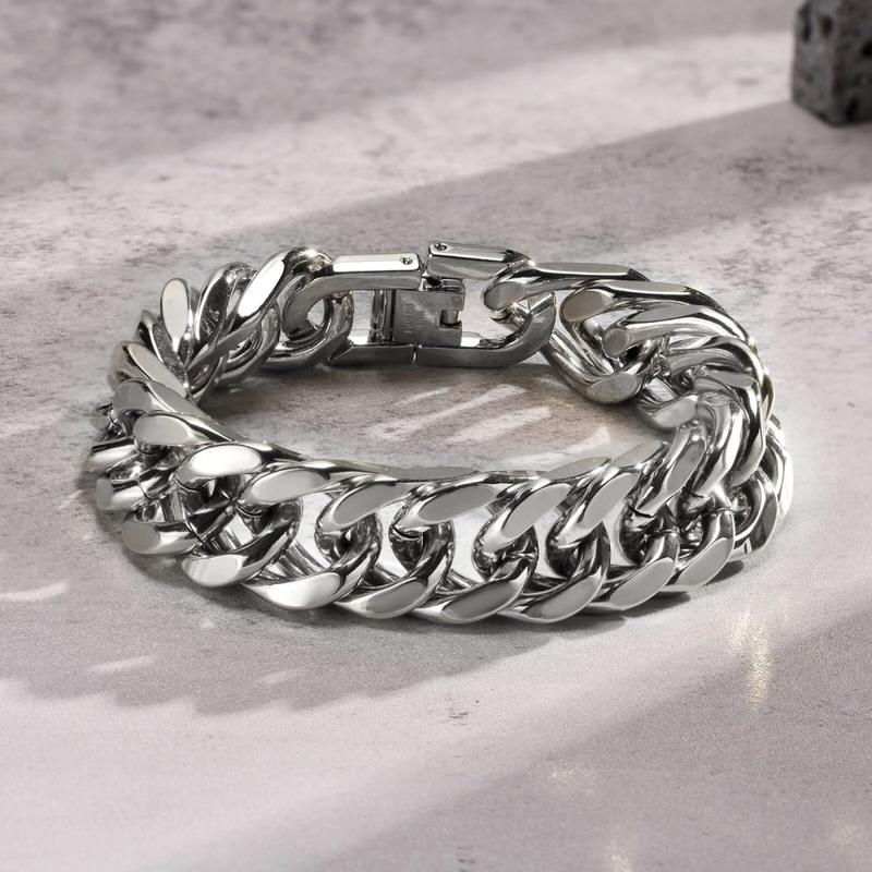 Чоловічий срібний браслет із неіржавкої сталі 316L Нова колекція чоловічих аксесуарів із неіржавкої сталі. Чоловічі срібні браслети — тренд у світі чоловічих прикрас! Аксесуар виготовлений із якісної та міцної неіржавкої сталі марки 316L. Розмір браслета 18-21 см, ширина ланок 12 мм. Зроблений у формі класичного, кубинського плетіння. Браслет гармонійно поєднується з іншими аксесуарами зі сталі та срібла. Зносостійкий, не іржавіє, не темніє, не окиснюється. Сталевий ланцюжок послугує чудовим доповненням до вашого образу, а також чудовим подарунком для вас і ваших близьких! • Матеріал: Неіржавка ювелірна сталь вищої марки (Stainless Steel) • Розмір на зап'ястку: 18 - 21 см • Довжина: 21,5 см • Ширина: 12 мм • Товщина: 6 мм • Застібка: Надійна застібка кліпса Кожен Браслет упакований у фірмову подарункову коробочку та пакетик