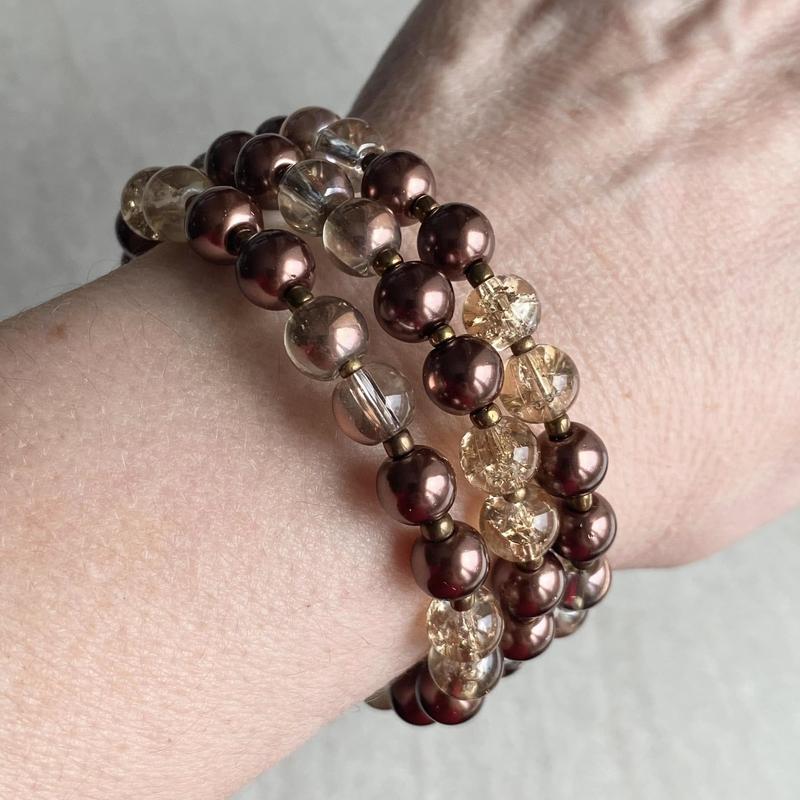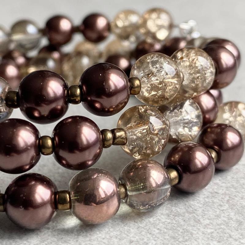 Браслет трьохрядний, зібран на сталевий меморі дріт, гарно тримає форму. Скляний намистини, розміром 8 мм.