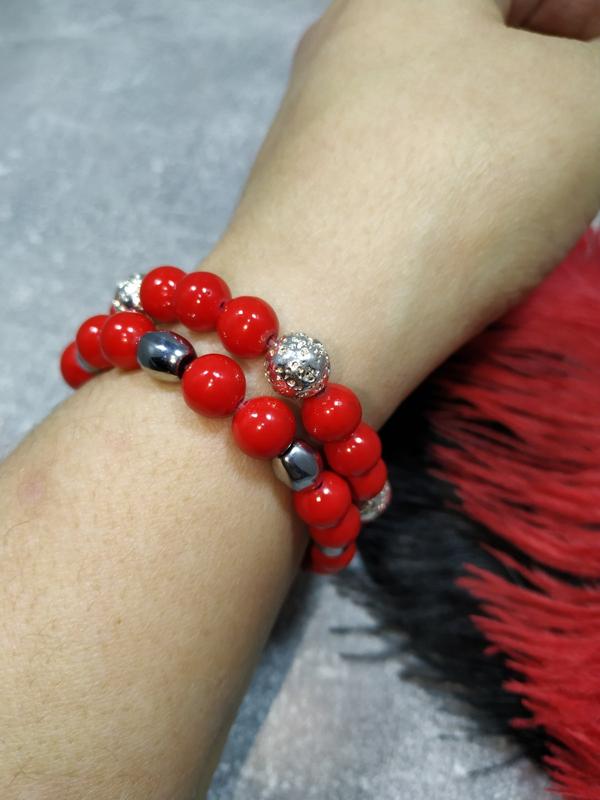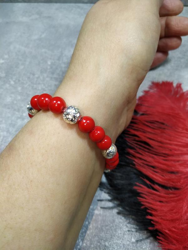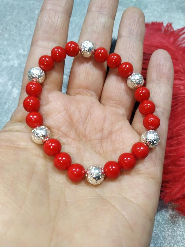 Браслет з намистин натурального корала і котячого ока з сріблом
