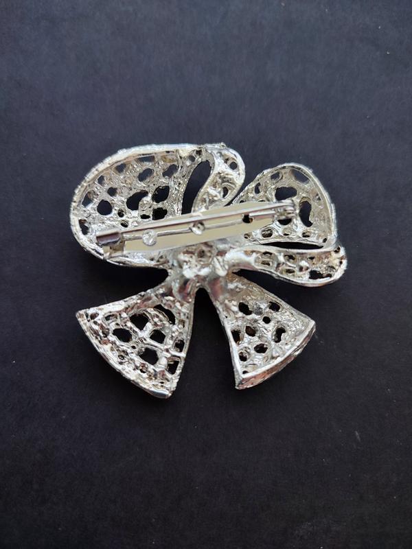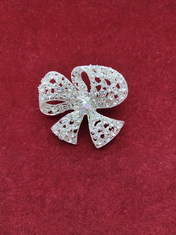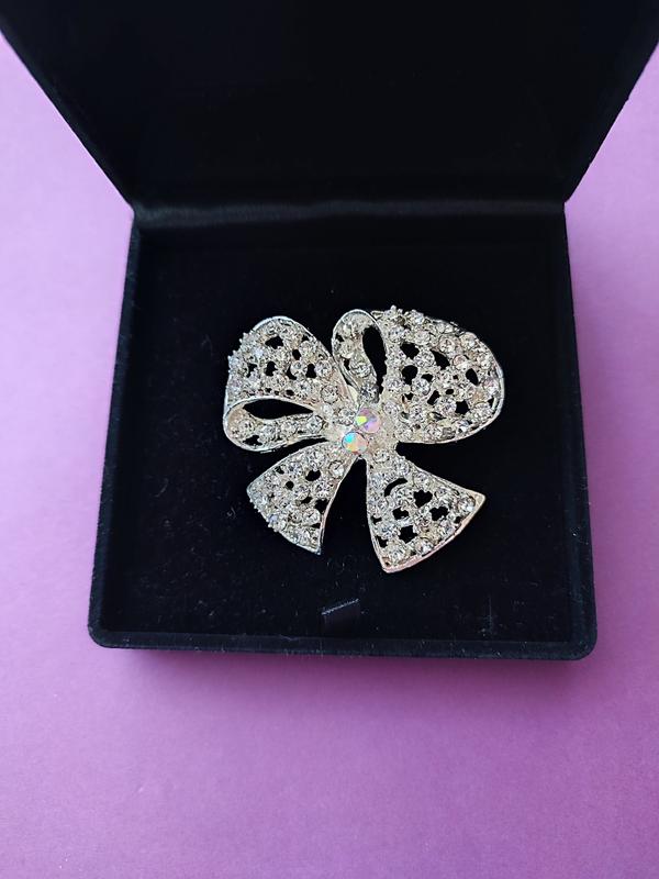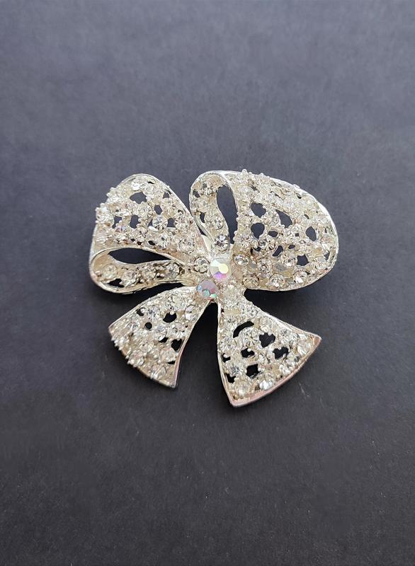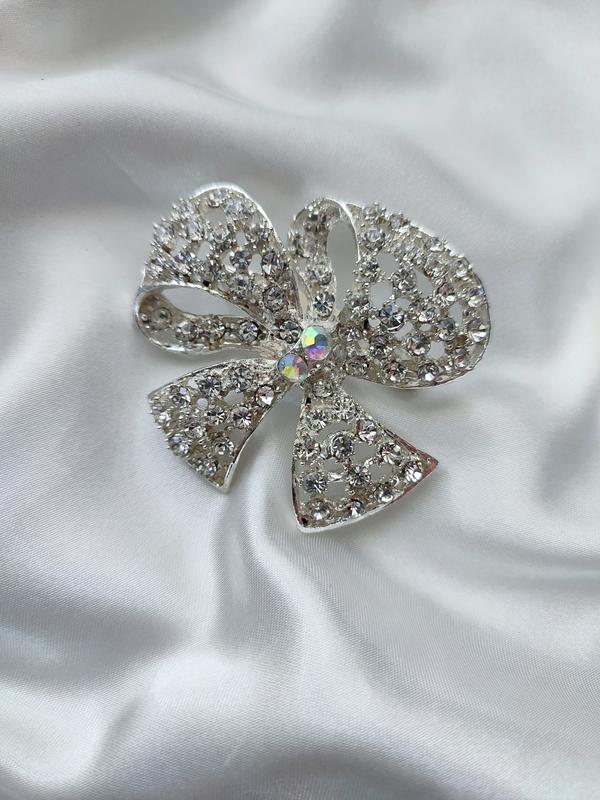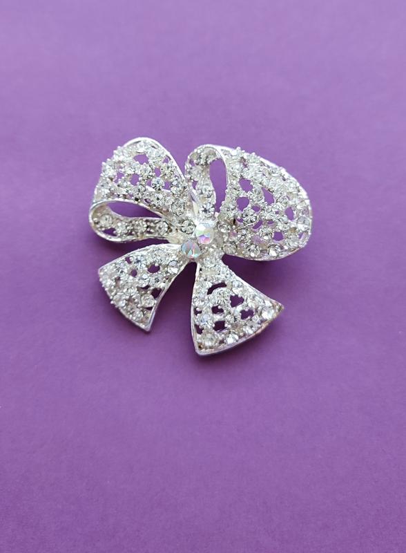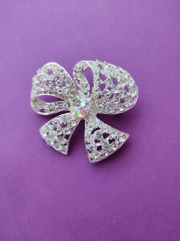 Розкішна брошка бант з кристалами - модна прикраса для вас!розмір: 5,5х5 смСклад: ювелірний сплав, сріблясте напилення, кристали.Також переглядайте інші прикраси на моїй сторінці.