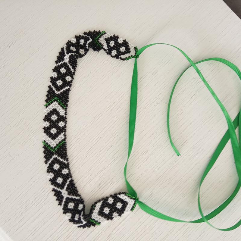 Симпатичний майже невагомий чокер довжиною 32 см , шириною 2,2 см. Відтворення прикраси відомої української письменниці Лесі Українки. Регулювання здійснюється за рахунок репсовій стрічки, довжиною 1 метр.