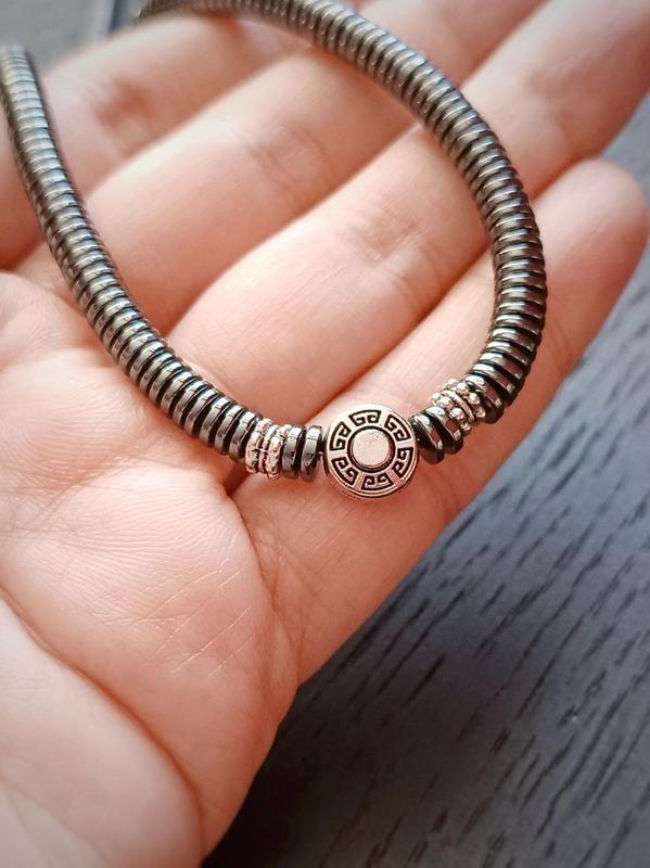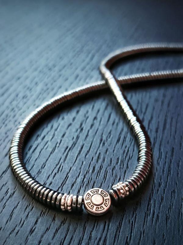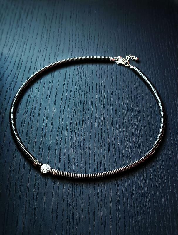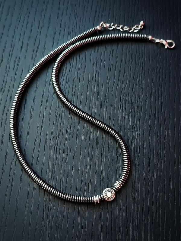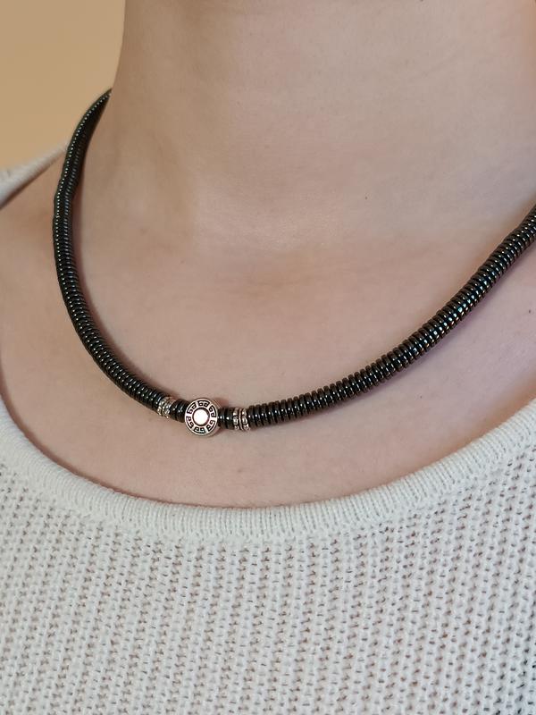 Стильний чокер із сотень чорних пласких гематитових намистин - одночасно лаконічний та витончений. Цей чокер ідеально доповнить Ваш сучасний елегантний образ, його мінімалізм легко поєднати як з діловим костюмом, так і з вечірньою сукнею. Довжина прикраси: 45 см.