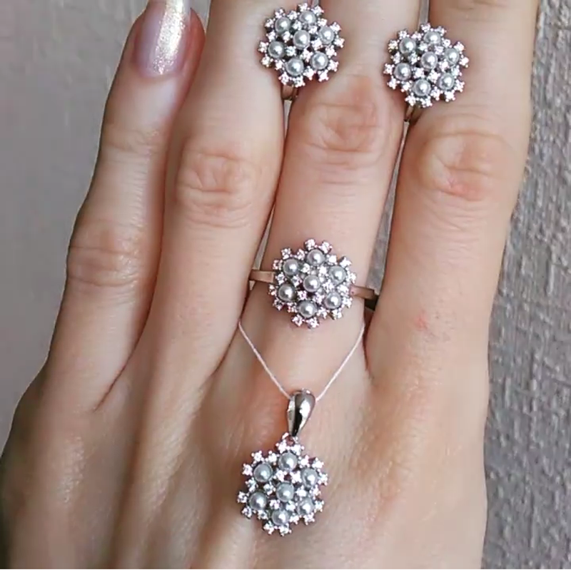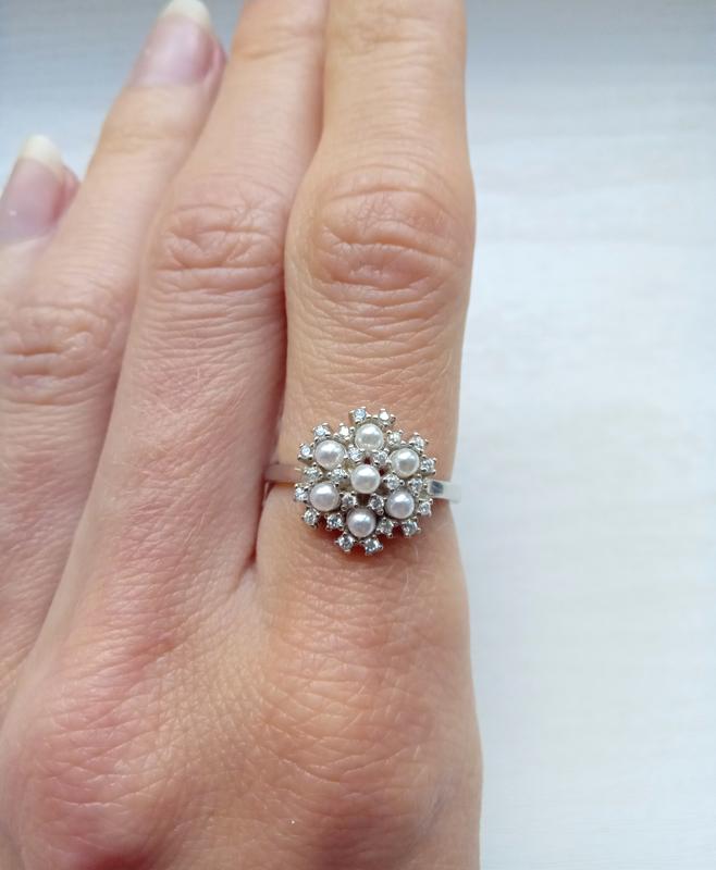 Каблучка з перлинками та цирконіями. Вага 2,57 гр.Розмір 16,5.В наявності такі ж сережки та підвіска.
