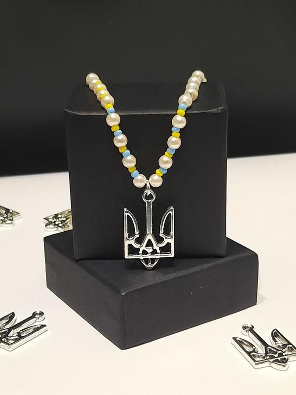 Патріотична підвіска з перлинок з металевим тризубом Розмір тризубця 2.5см на 1.5 см Металева застібка має додаткові кілечка для регулювання Ручна робота