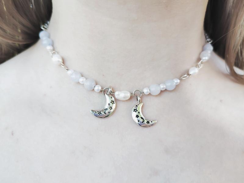 Місячне кольє чокер з перлинами та аквамарином