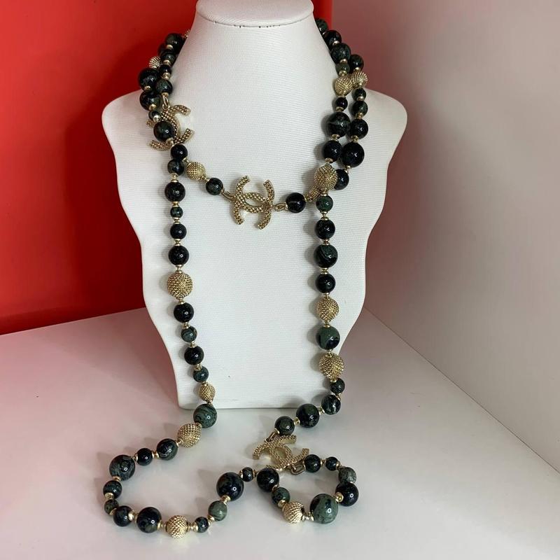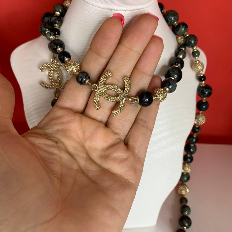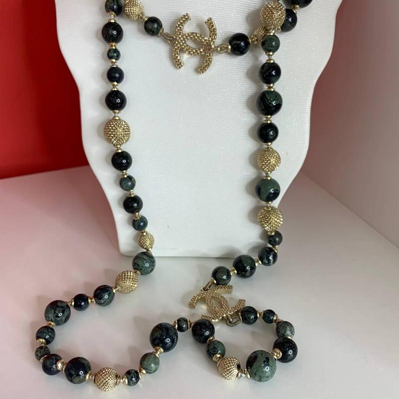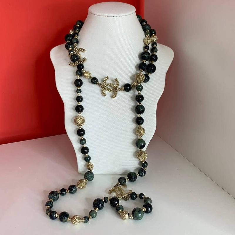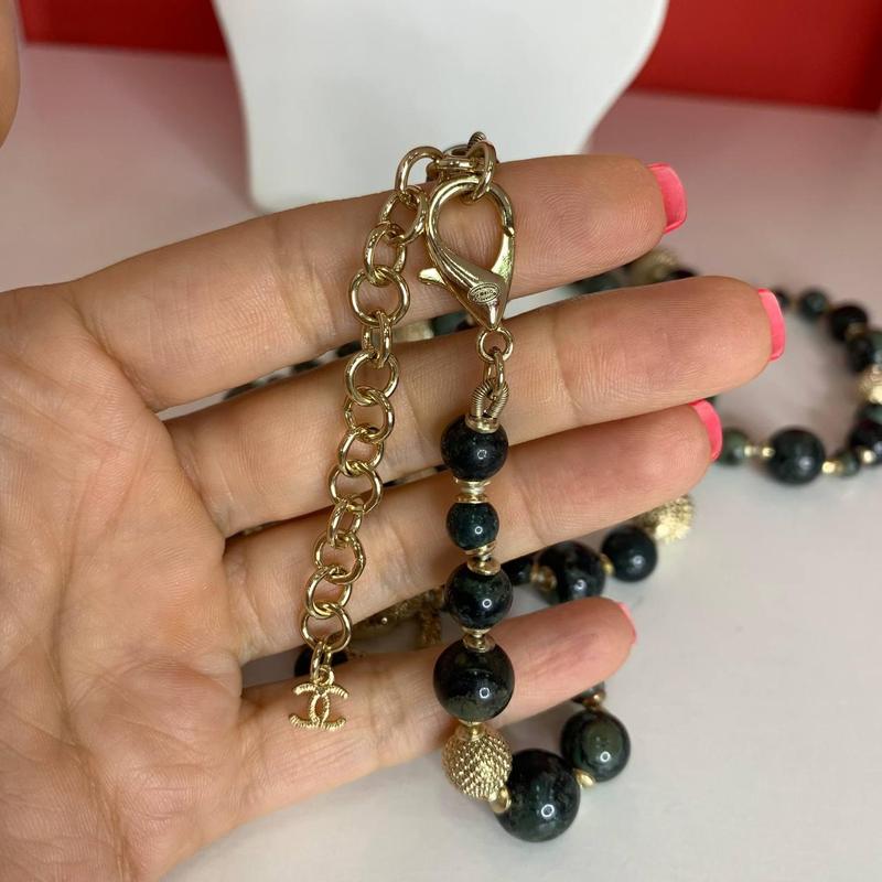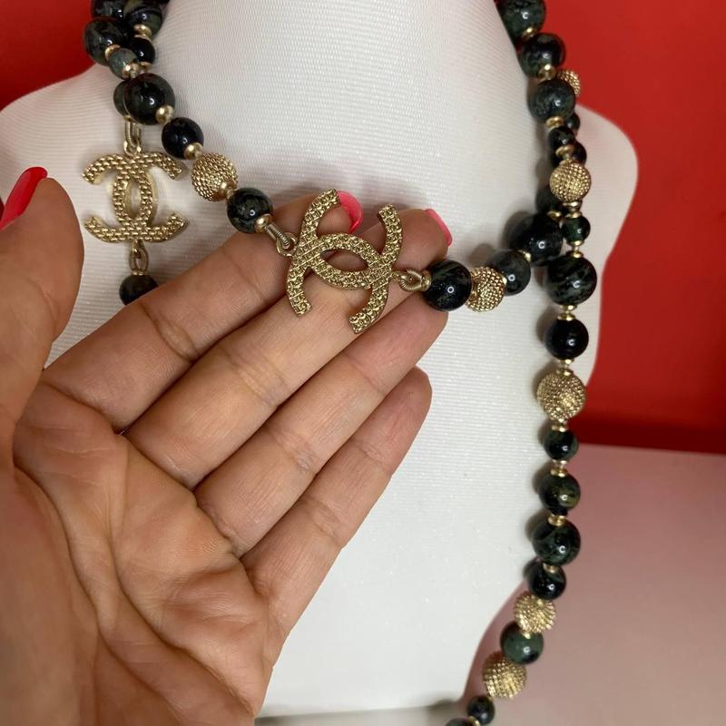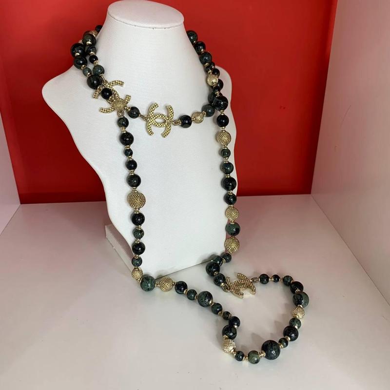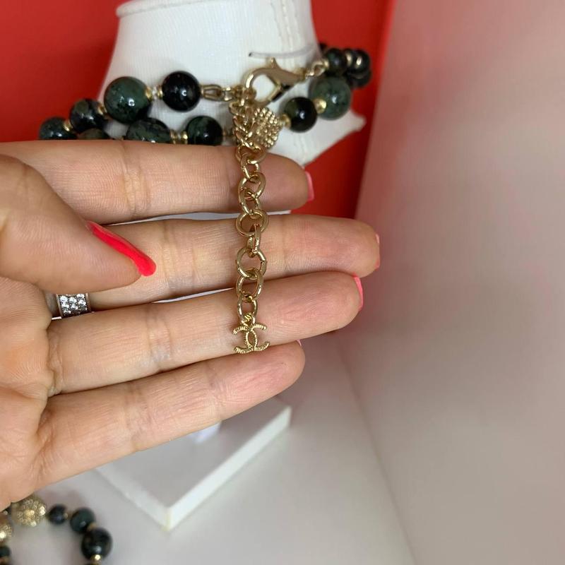 Подвеска длинная с черно-зелеными и золотыми бусами - дополнит томный