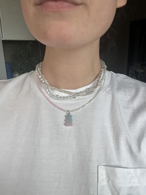 Прикраса з використанням бісеру двох видів та підвіска у вигляді медведика. Довжина: 30 см + 7 см регульована застібка. Фурнітура не темніє, витримала навіть морську воду 💪🏻