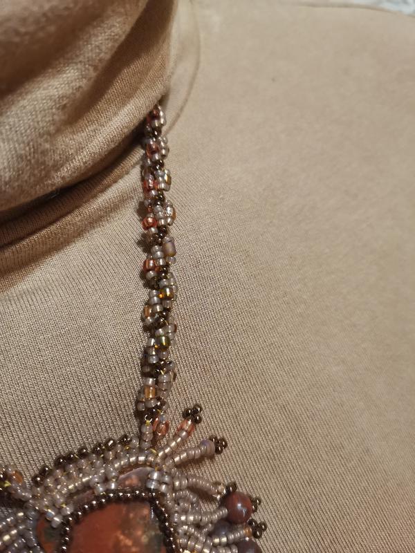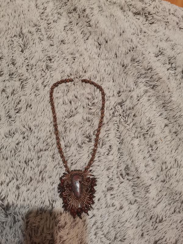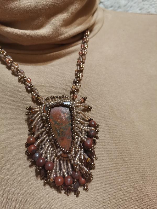 Красиве кольє з кулоном у коричневих тонах.Камінь і намистини з натурального каменю. (какою саме не знаю).На застібці стоїть проба 925.окружність — 44довжина кулона — 7 смПересилаю УП або НП