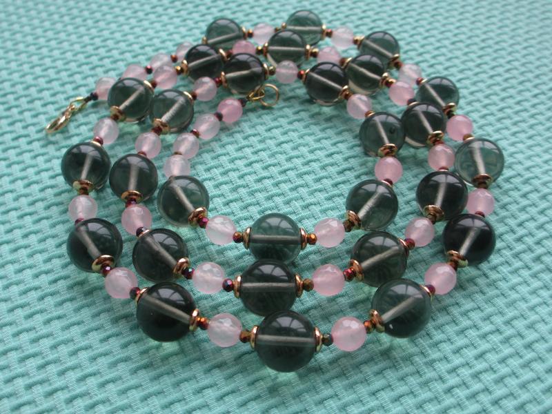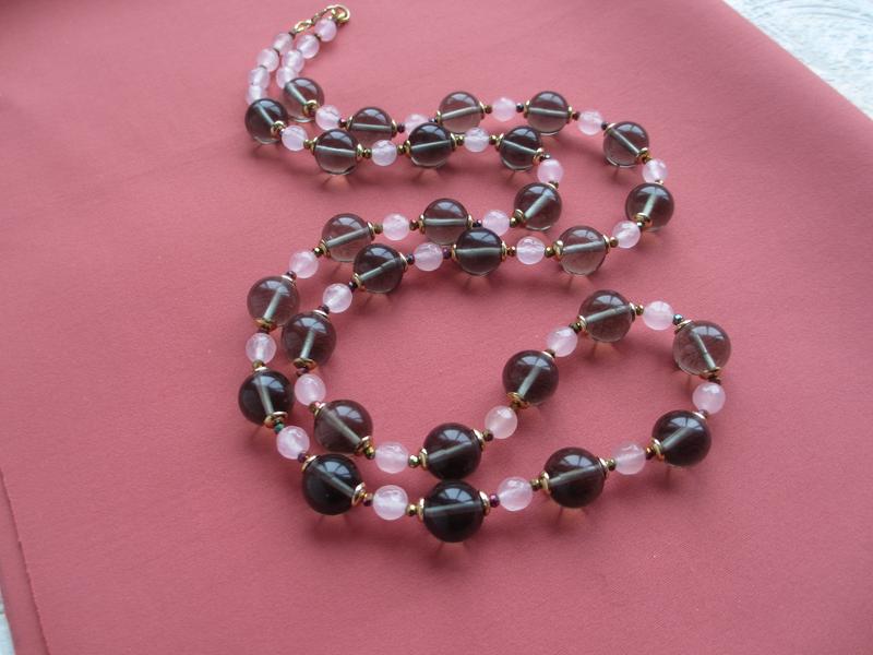 Масивне подовжене кольє з великих скляних намистин кольору раухтопазу та гранованих намистин рожевого кварцу. Можна носити на повну довжину або робити два оберти навколо шийки. Стримане і водночас ошатне оздоблення.