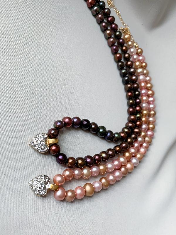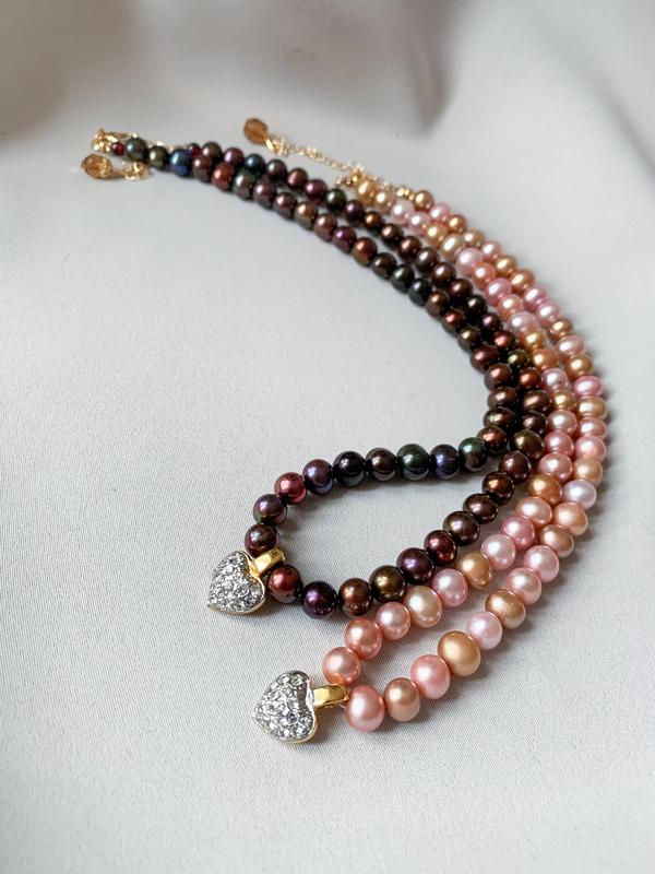Намиста зібрані вінтажних натуральних перлин. Кулони сердечка теж вінтажні, кристали сваровські.