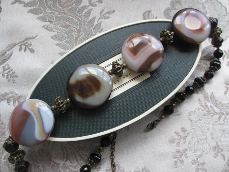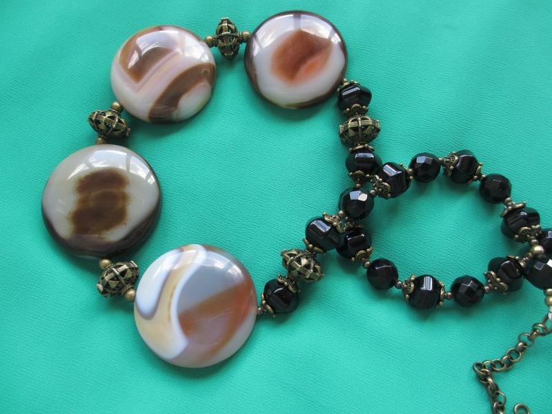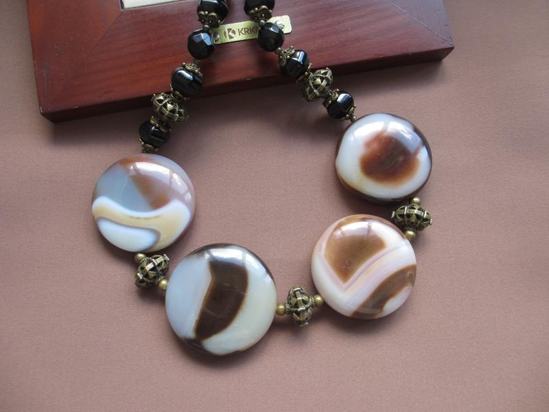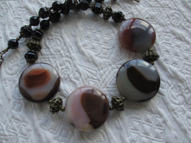 Масивне кольє з шикарних величезних намистин агата в рожево-сірих тонах. Додані грановані намистини чорного агату та латунна фурнітура. Кольє "на шанувальника", для гурманів каменю. Не оцінити їхню красу неможливо.