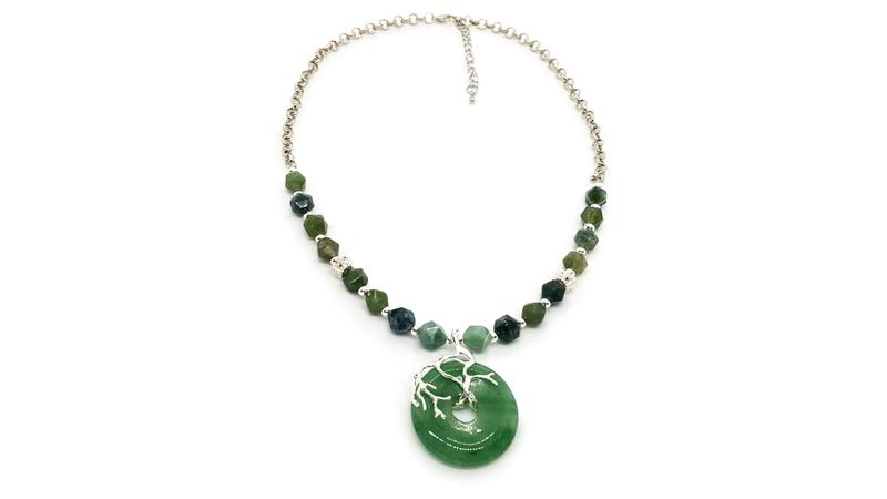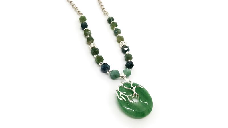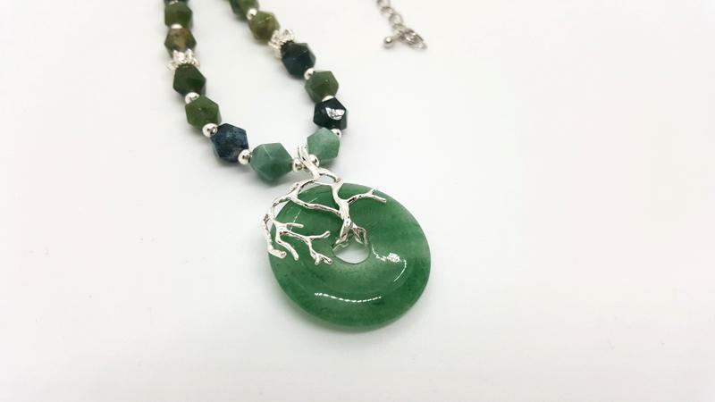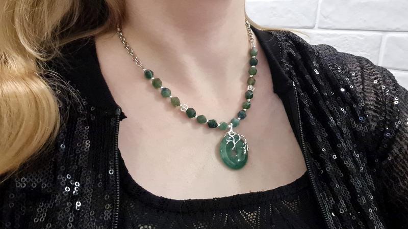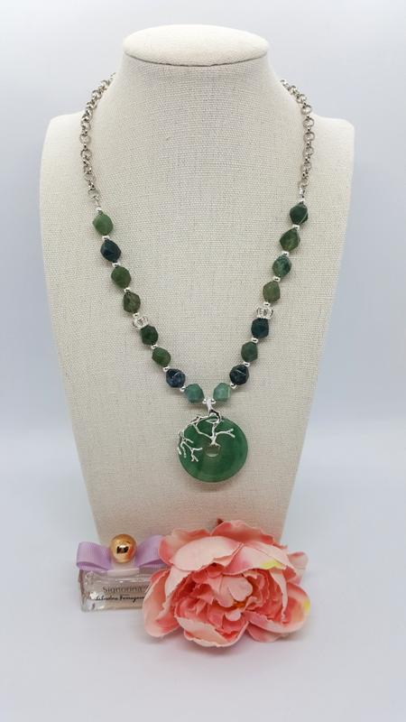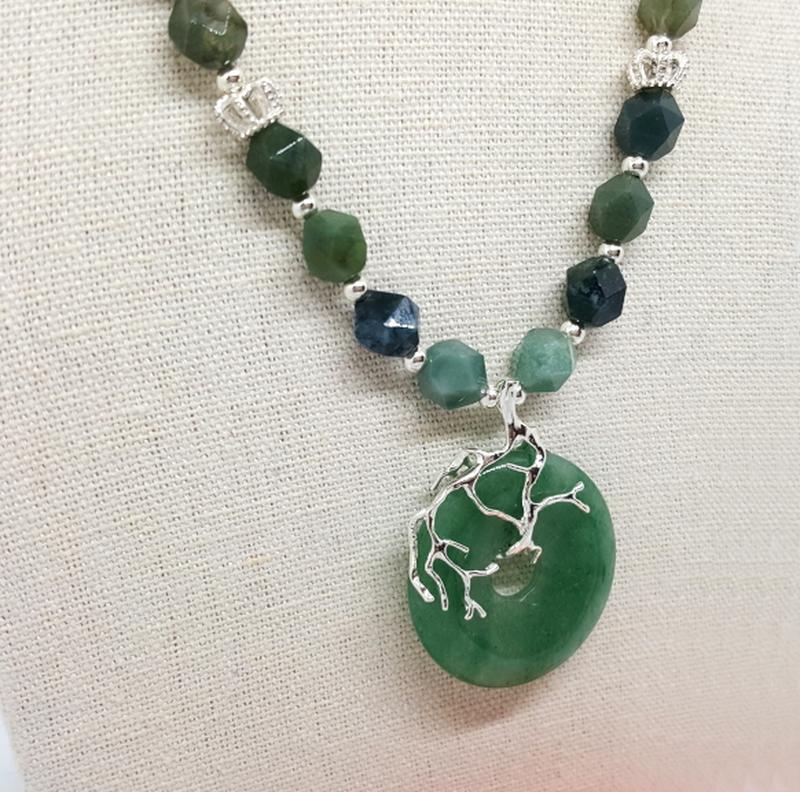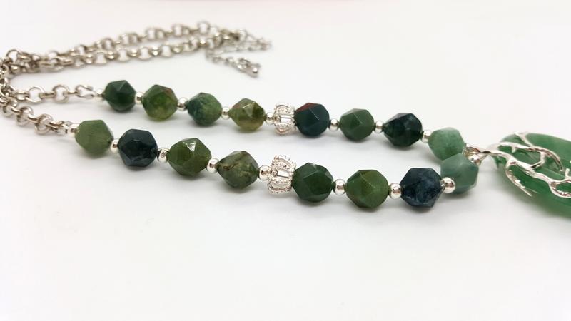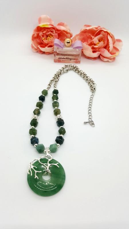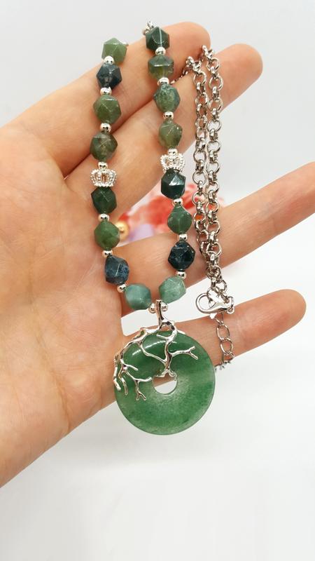 💚⛓️ Красиве, яскраве кольє-чокер з намистин натурального граненого мохового агату з підвіскою у формі донату з натурального зеленого авантюрину з прикрасою - срібляста гілочка. Потилична частина - ланцюжок з нержавіючої сталі.