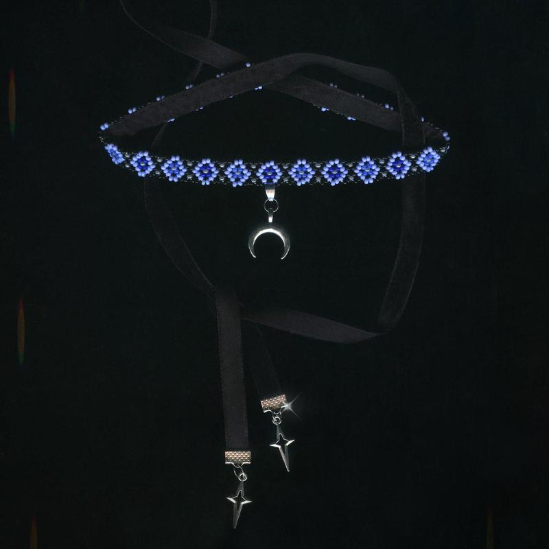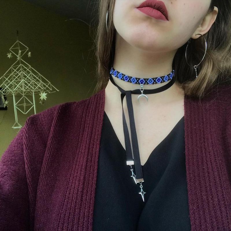 Бісерне полотно нашите на оксамитову м'яку чорну стрічку, а на кінчиках висять зірочки які можна зав'язувати різними способами
