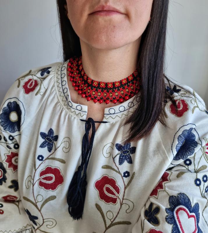 Традиційна українська силянка виконана у етно стилі. Підійде як до традиційного народного стилю, так і до повсякденного образу. Силянка виготовлена з якісних матеріалів: 🔸️чеського бісеру; 🔸️застібка з нержавіючої сталі; 🔸️кришталь; 🔸️натуральне каміння - червоний корал. Довжина з застібкою - 35 см + 6 см ланцюжок подовжувач. Якщо потрібно інший розмір, напишіть про це при замовленні. В цьому випадку час виготовлення 2 дні.