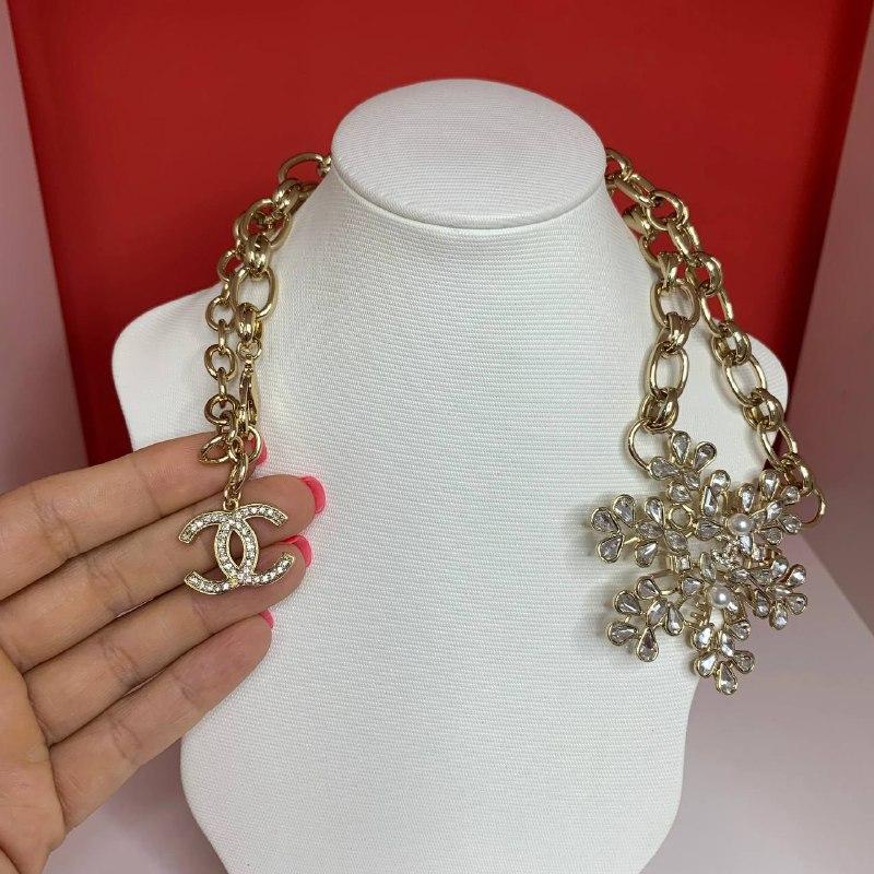 Чудова брендовий підвіска-намисто у вигляді сніжинки з кристалами. Ланцюг з великими ланками покрита позолотою. Дане прикраса можна носити як довгий ланцюг і як короткий кольє. Ззаду на регулювальних кільцях підвіска у вигляді логотипу Шанель. Є гравіювання.