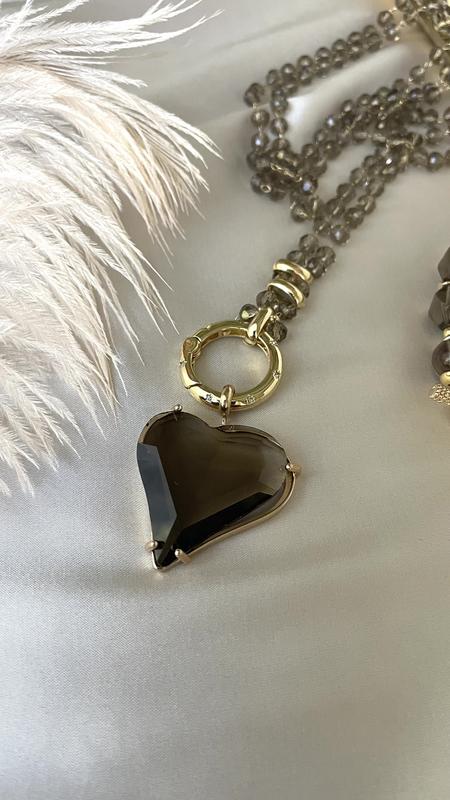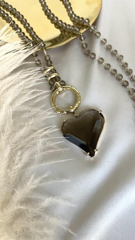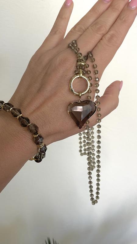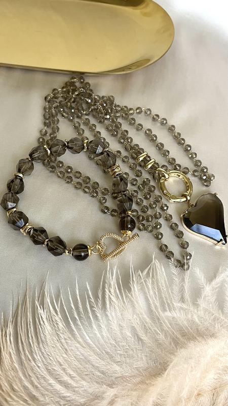Браслет з димного кварцу і гематитовими вставками. Підвіска з кристалу у формі серця. Сотуар з кришталевих намистин. Довжина 100 смБраслет 550 грнСотуар 750 грн