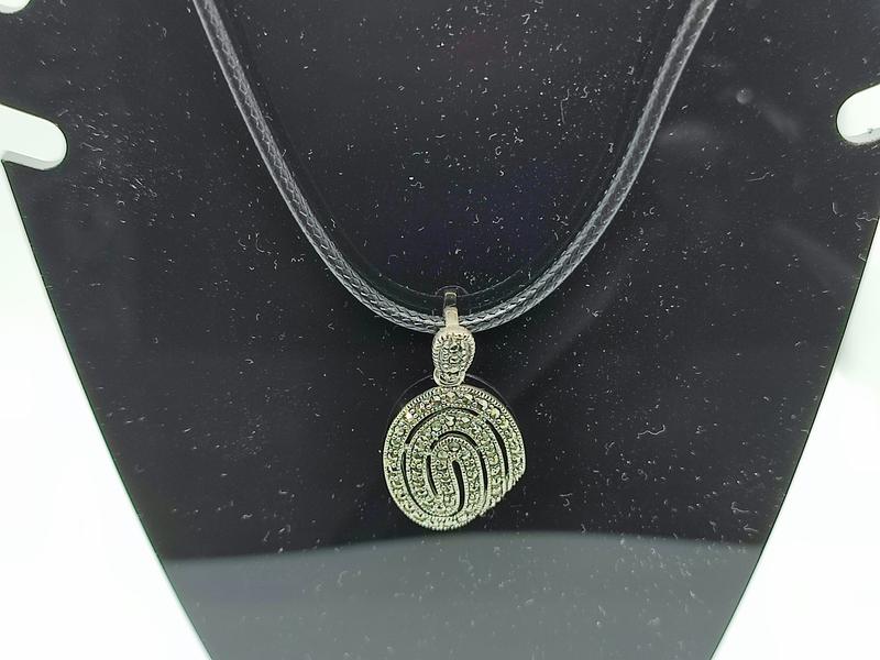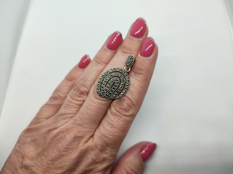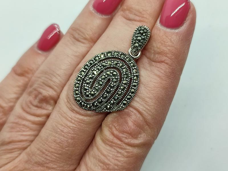 Серебряный кулон с натуральными марказитами.Размер поверхности 35*20 мм.Вес 4,3 г.Серебро 925 пробы, без покрытия.Производитель Таиланд.Шнурок в подарок к кулону.