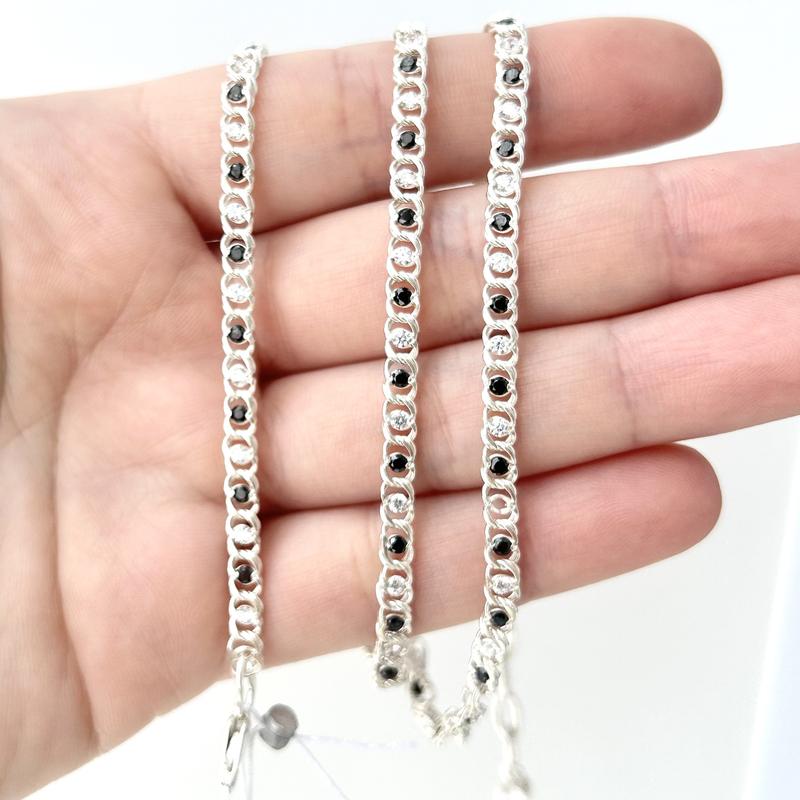 Жіночий срібний ланцюжок, кольє 925 проби з чорно-білим камінням фіанітами. Вага 12.8 - 13 гр.Довжина 45-50 см (регулюється за допомогою ланцюжка)Красива, яскрава, ніжна і жіночна прикраса на шию з білого срібла, чудово поєднується з сяючими контрастними каменями. Кольє має ошатний, стильний і не звичайний вигляд. Плетіння арабський бісмарк - стильна класика, яка славиться своєю міцністю і практичністю.дана модель в різних варіантах: чорні, білі, чорно-білі камені; вага 10-25 гр; довжина 40-55 см. У комплект є браслети універсального розміру. Швидке замовлення і наявність - у менеджера будь-яким зручним способом.Вироби заводські, мають пробу, ярлик і пломбу