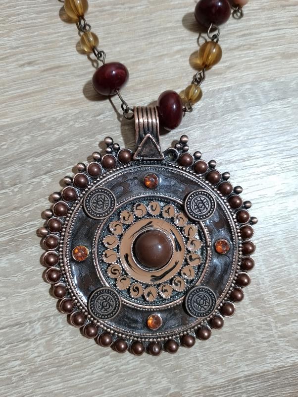 Індійське намисто на ланцюжку з бусами з пластику на застібці та великим круглим плоским медальйоном із мідним покриттям ззаду та блискучим лаковим покриттям спередуза контуром намистинки, під вушком однієї бракує.