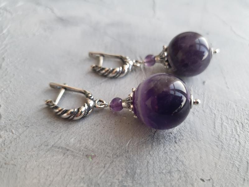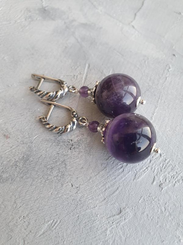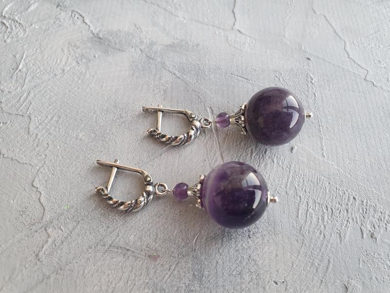 Сережки срібні "Аметист". Сережки з срібними швензами і бусиною аметиста "Шеврон". Розмір намистини 15 мм Загальна довжина 4 див. Намистини темно фіолетові, з красивими срібними швензами типу "чалма".