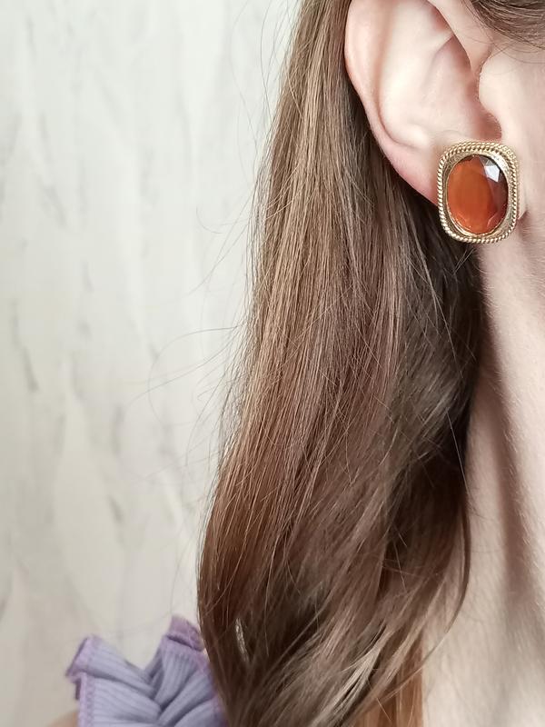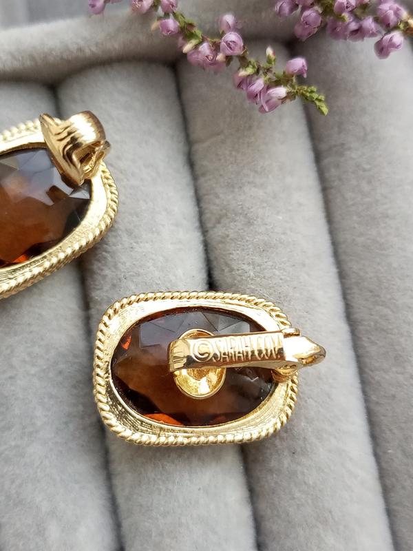 Красиві вінтажні кліпси від Sarah Coventry із колекції "Golden Embers".Вперше були показані в квітневому каталозі Sarah Coventry 1968 року.Вставка - гранований синтетичний топаз овальної форми.Стан ідеальний.Розмір 2,1 см * 1,6 см.