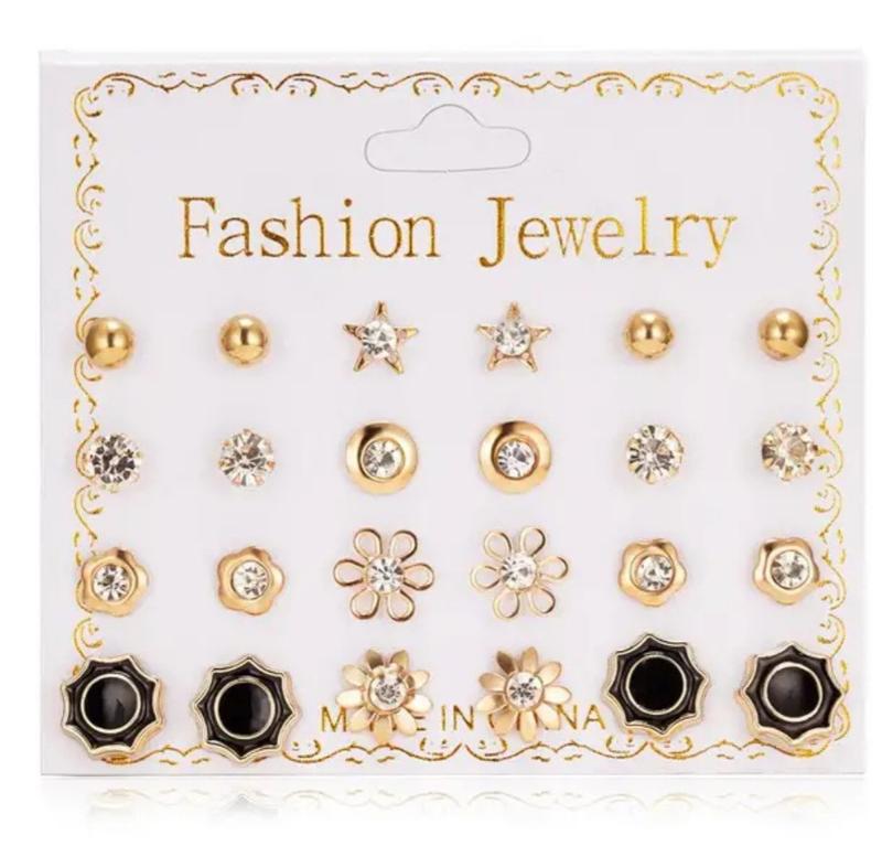Набір жіночих сережок (12 пар) декор каміння колір золотистий