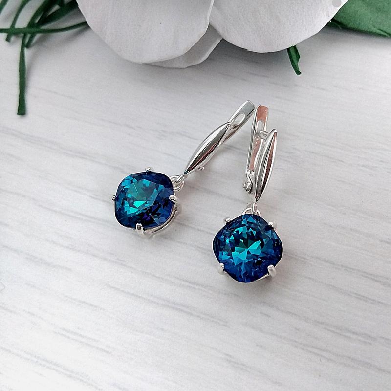 Яскраві сережки ручної роботи з оригінальними кристалами Swarovski діамантового (ювелірного) огранування. Форма каменю — квадрат із заокругленими кутами. Колір — Bermuda Blue - один з самих популярних хамелеонів у палітрі кольорів Сваровські - темно-синій кристал з бірюзовими переливами всередині кристала. Розмір кристала 10×10 мм Довжина сережки приблизно 29 мм Фурнітура виробництва України зі срібла, якість відмінна. Застібка - англійський замок, тримає міцно та надійно. Чудові сережки на кожен день і для особливого випадка!