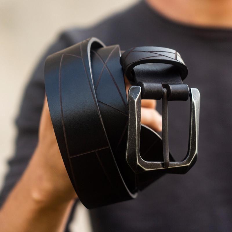 Шкіряний чоловічий ремінь geometric — чорний (італійська шкіра, французька пряжка idam, гр...