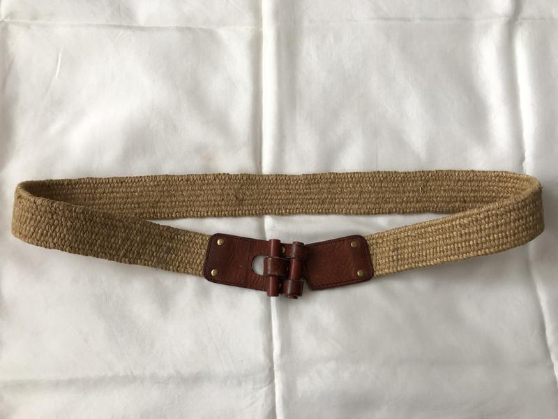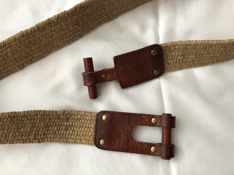Пояс , ремінь Circa®. Вінтаж. Зроблено в Тайвані. Виконаний з натуральної шкіри і джуту в натуральних відтінках. Відмінно виглядає у одягом з натуральних волокон( льону, бавовни) Полотно пояса еластичне, застібка з дерев'яних елементів і шкіри. Розмір: вказаний М Фактичні заміри: окружність в не розтягнутому стані 90 см, тягнеться до 100 см і більше. Ширина полотна-3.5 см, висота пряжки-4.5 див. Склад: натуральна шкіра, джут, еластан, дерево. Стан: ідеальний, без дефектів