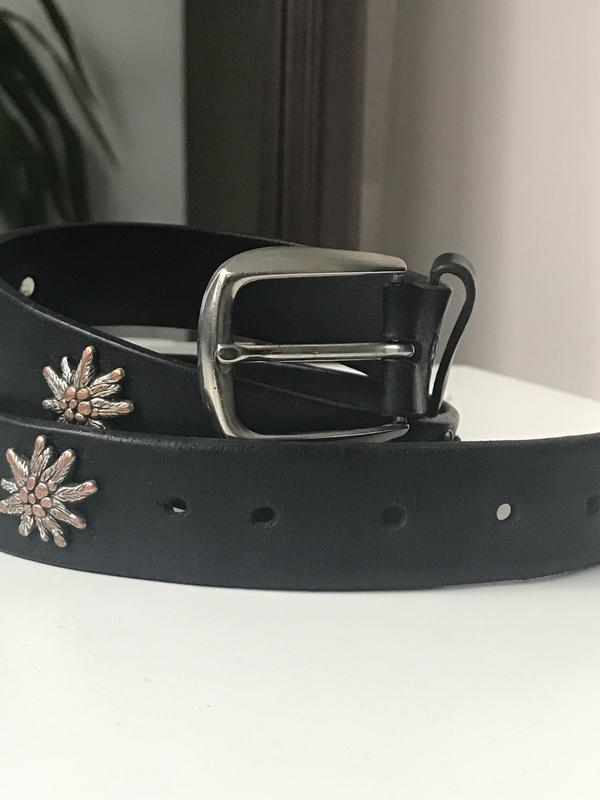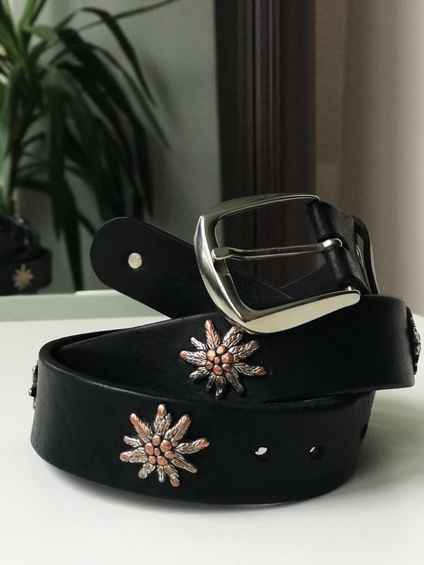 Шкіряний ремінь з эдельвейсами, зроблений у Швейцарії. Мінімальні сліди шкарпетки, самі едельвейси з міді з покриттям. На талію - хв. 63, максимум - 73 см Ширина - майже 3 см