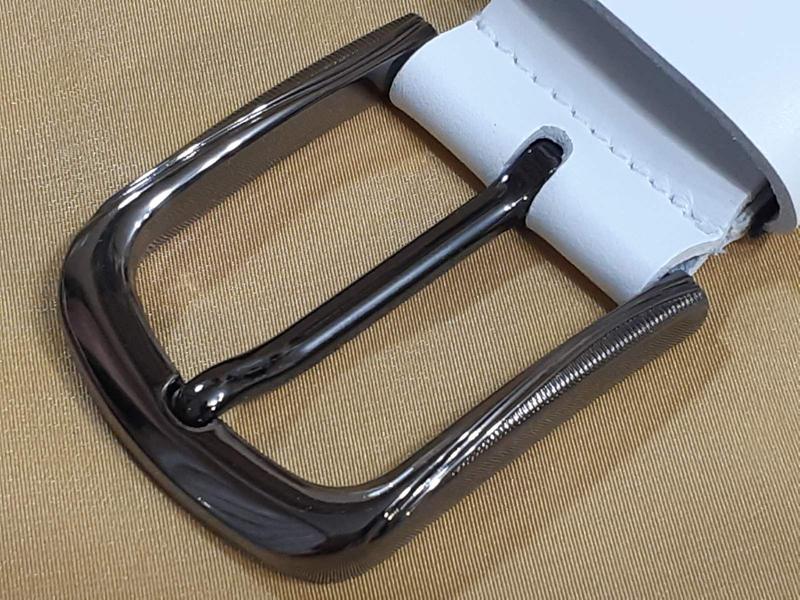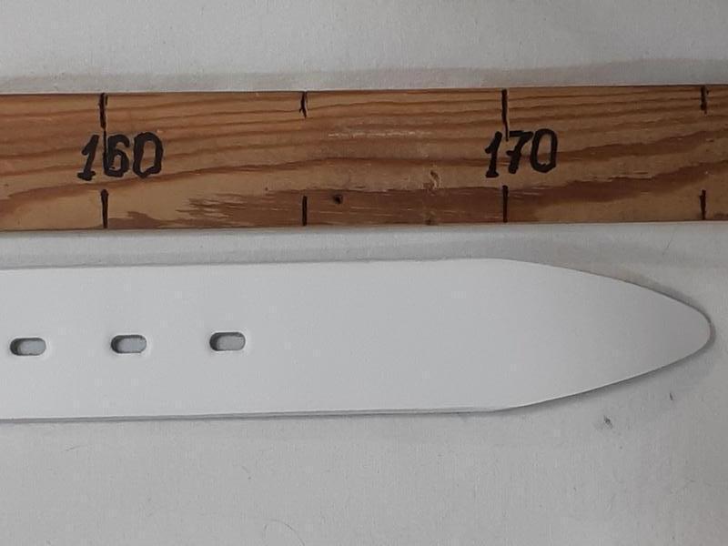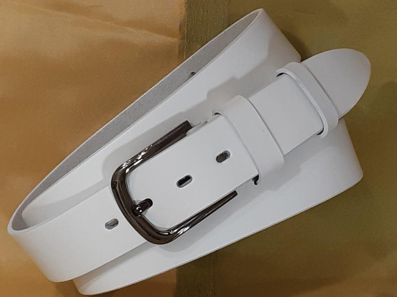 Красивий білий шкіряний джинсовий ремінь дуже великої довжини (батал). Ширина смуги 3,9 см; довжина ременя до звуження смуги 170 см (на об'єм до 150 см; дуже товста шкіра: товщина шкіри 4,1 мм. Шкіра м'яка, гладка, щільна, з невеликим глянцем. Пряжка чорна лакова. Чудовий подарунок. Ремінь коротшає.