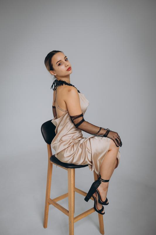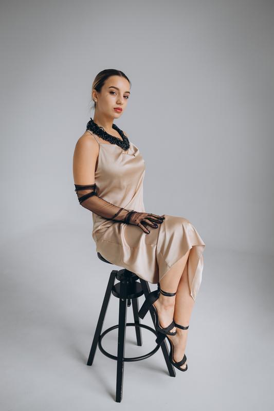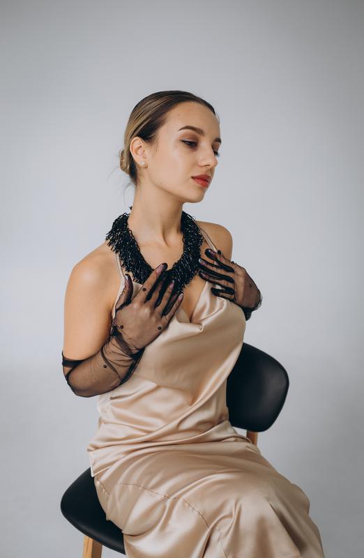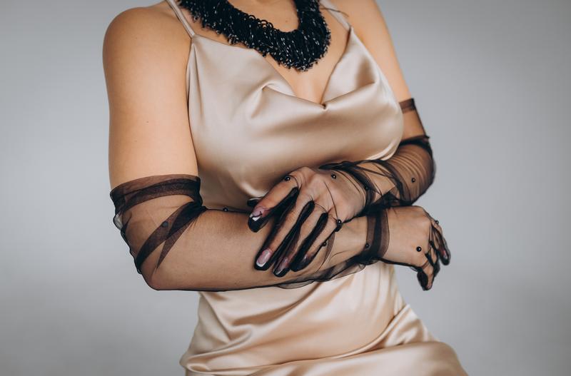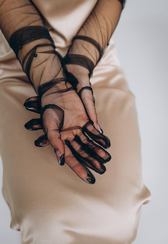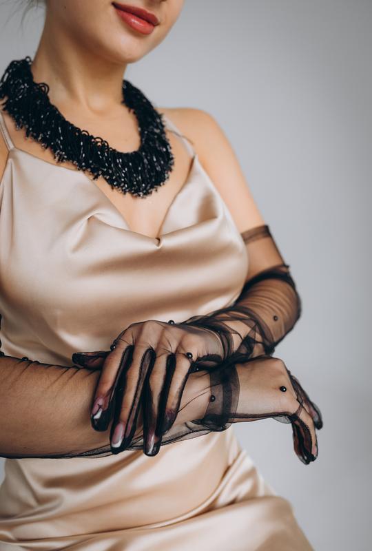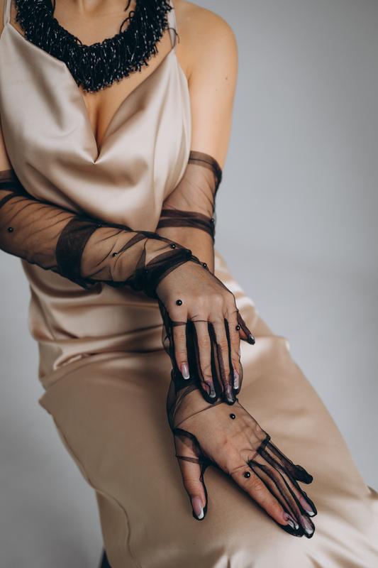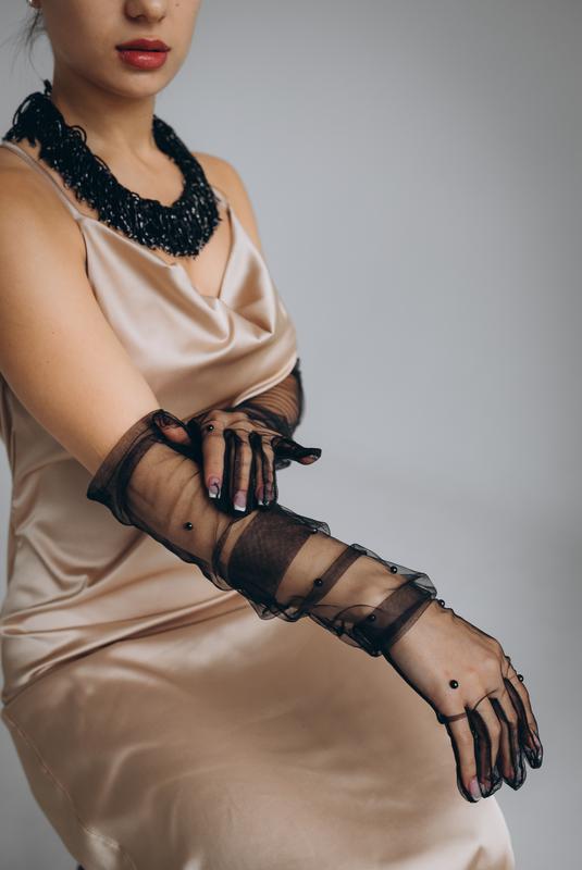 Еластичний матеріал добре тягнеться, дуже приємний до тіла. Половинки перлин приклеєні на силіконовий клей, який не відшаровується і не жовтіє. Рукавички прозорі, фатинові, довжиною вище ліктя.