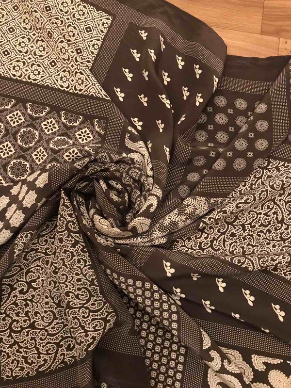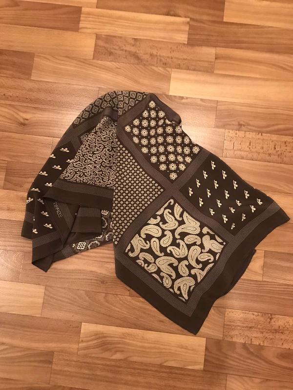 Дуже гарний дизайн хустки відомого бренду. Всі бирки є. Стан ідеальне,микрозацепка і стетик -в шкарпетці невидно,фото не передає. Шов не роуль. Розмір 86*89
