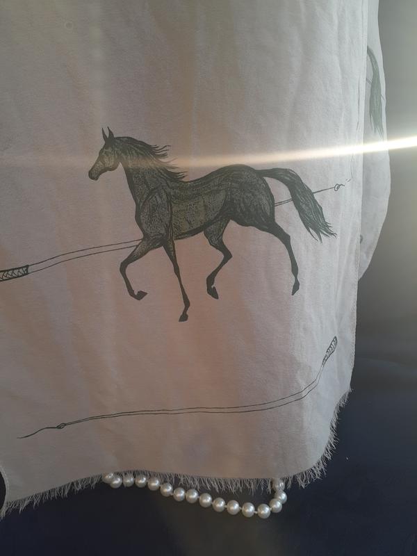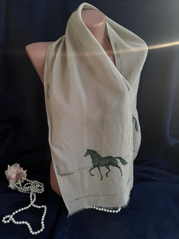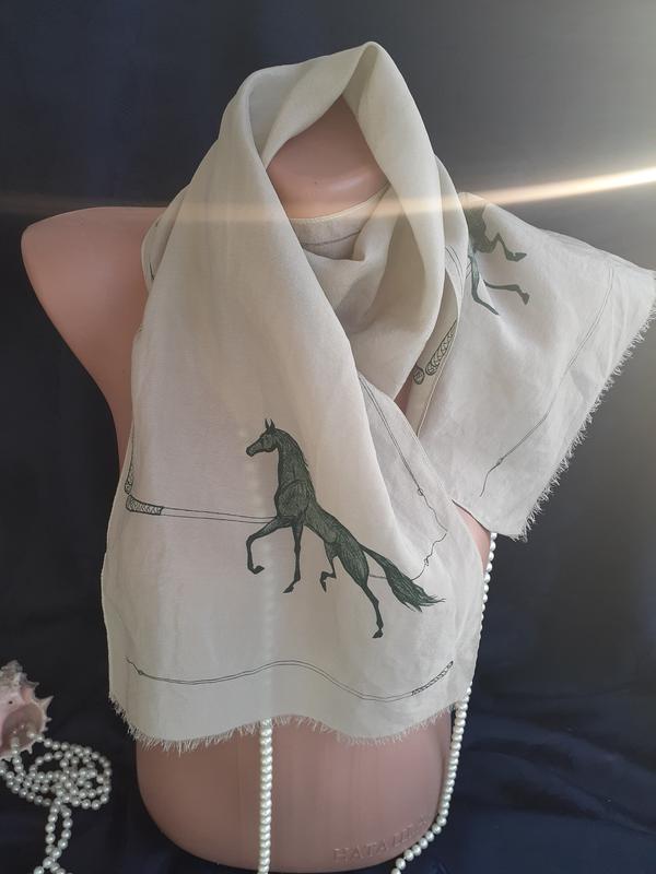 Символ витонченої жіночності, - пастельний шарфик з ексклюзивним принтом, - Polo! Це багатофункціональний аксесуар, про який тільки можна мріяти, особливо коли мова йде про речі з історією! Ніжний оливковий відтінок доповнено сюжетним принтом на межі мистецтва! Грація коні та й м'якість крепдешину! Виконаний з 100% натурального крепового шовку, - унікальної тканини зі злегка піщаною структурою. Оригінал, вінтаж. Розмір: 26 × 120 див. Стан відмінний, без дефектів. Яскраві і ніжні переливи шовку вже більше п'яти століть доповнюють образ красунь, це незамінна деталь гардеробу, поза часом і модою! Дозвольте собі цю класичну елегантність!