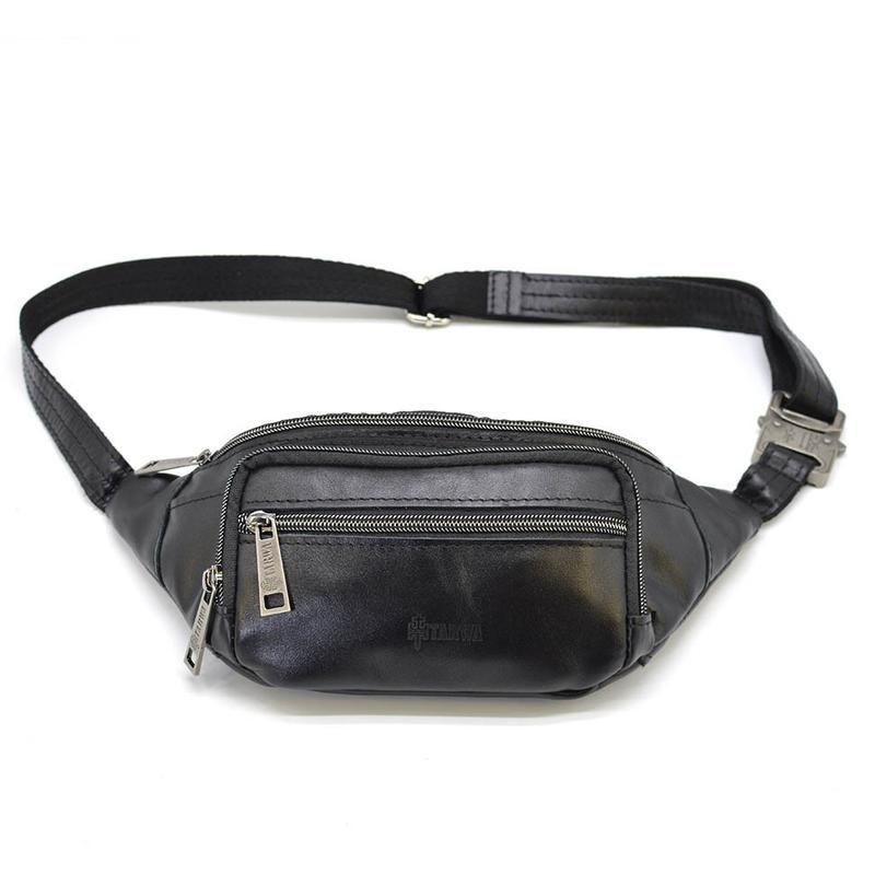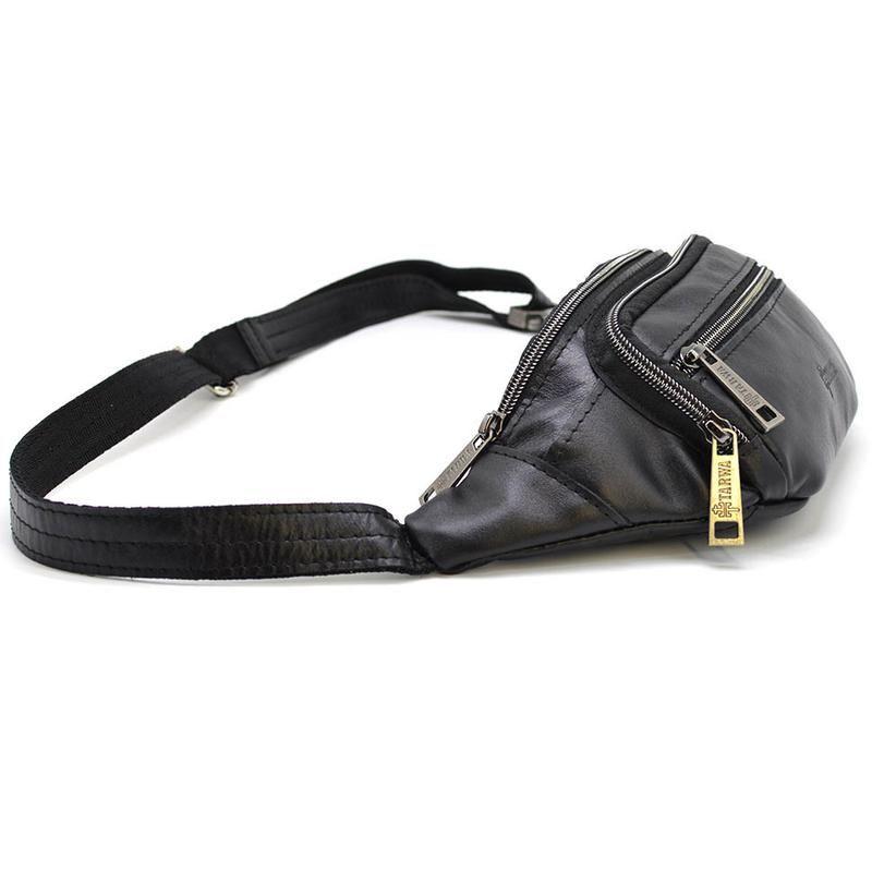 Бананка шкіряна, сумка поясна чорна TARWA GA-7218-3md. Сумка має два великі основні відділення, передню накладну кишеню на блискавці та передню плоску кишеню на блискавці. Повністю шкіряний напоєний ремінь і металевий фастекс.