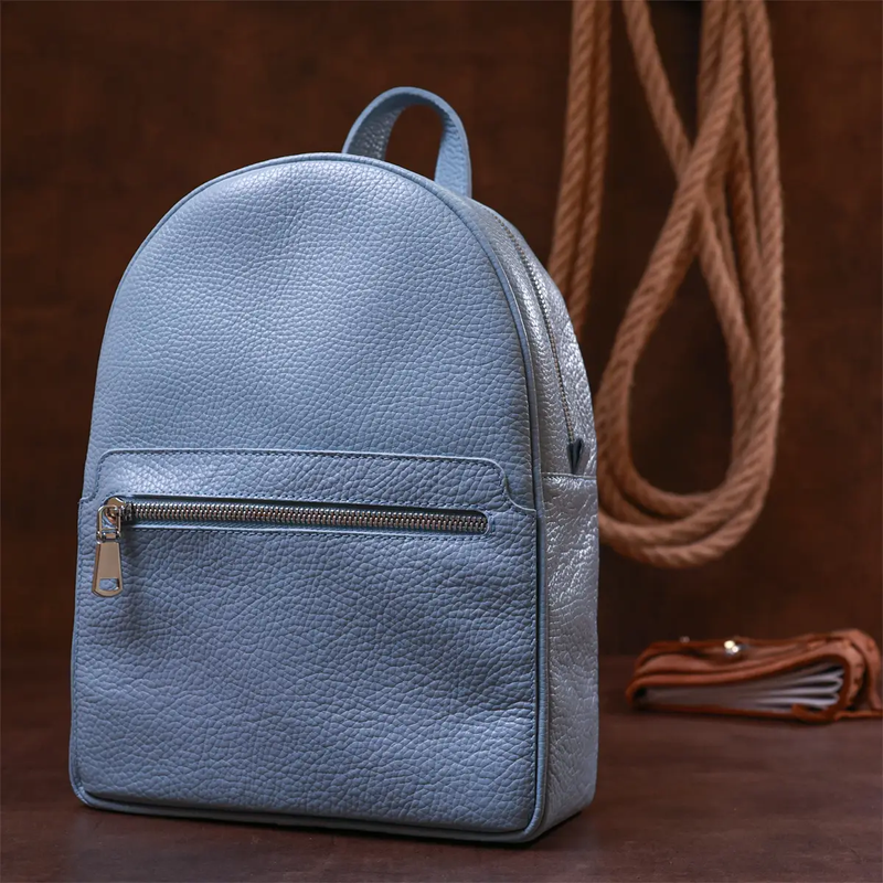 Стильний блакитний якісний шкіряний рюкзак. Натуральна шкіра флотар з зернистою рельєфною поверхнею. Розмір: 28х21х10 см. - поміститься книга, щоденник, звичайна зошит формату А5, невеликий планшет. 2 кишені всередині: на блискавці і відкритий. 8 КОЛЬОРІВ на вибір: жовтий світлий жовтий (лимонний відтінок), коричневий,червоний, рожевий, блакитний, чорний, бузковий (ліловий) Великий вибір жіночих рюкзаків ( натуральна шкіра, еко-шкіра, тканинні) https://shafa.ua/member/tir79?category=67