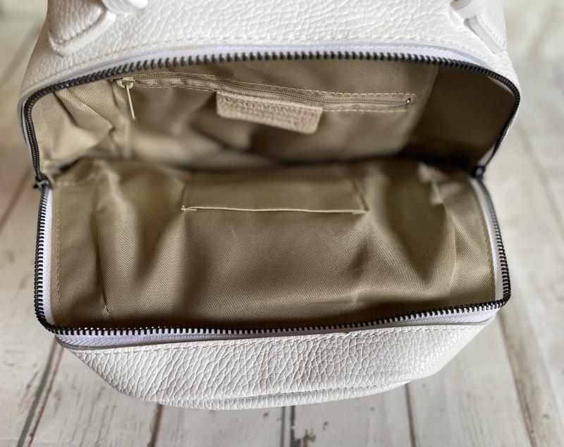 Одне загальне відділення, закривається на змійку. Підкладка з тканини бежева, є кишенька на блискавці та відкрита кишенька (на телефон).