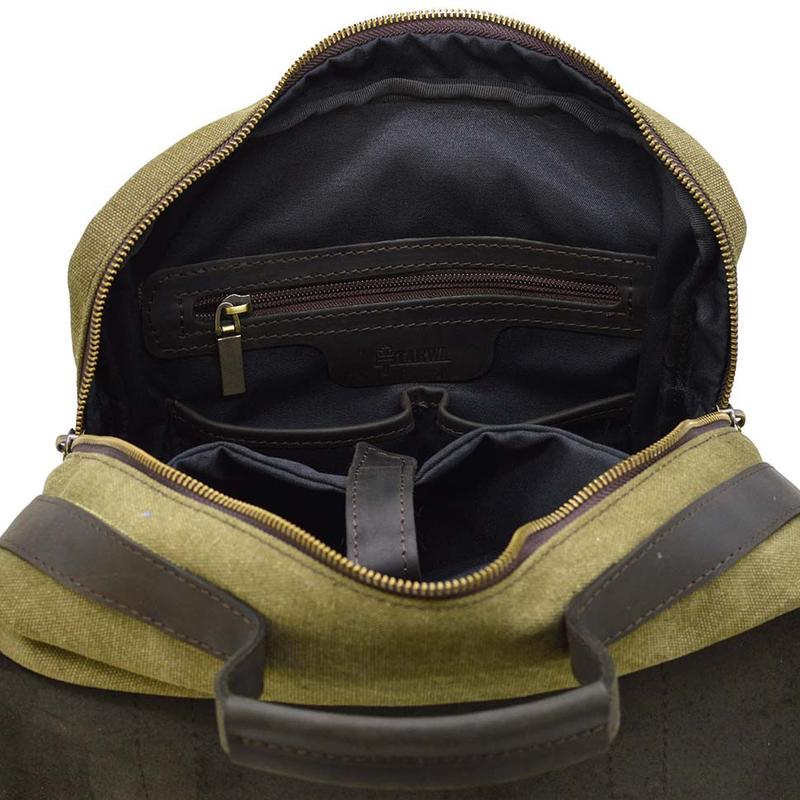Всередині рюкзака з канвасу 3420 від ТАРВА багате наповнення. Кишеня для ноутбука на липучці, кишеня на блискавці для важливих документів, дві відкриті кишені зі шкіряними торцями для довговічності.