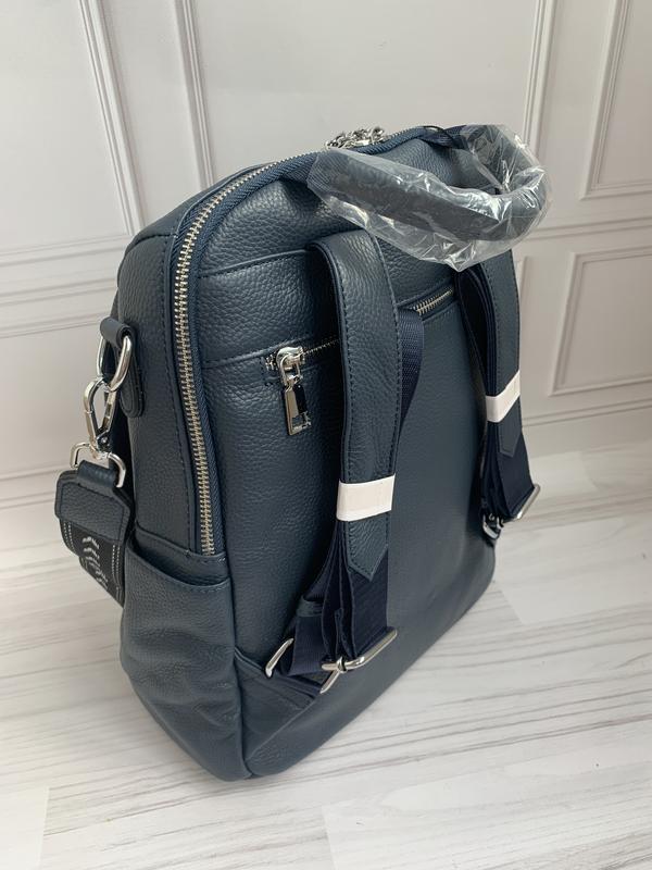 Рюкзак виконаний із м’якої натуральної шкіри із застосуванням надійної металевої фурнітури. Рюкзак має одне містке відділення на блискавці. Всередині дві відкриті кишені і дві на блискавках. На лицьовій стороні розташовані дві вертикальні кишені та одна горизонтальна на блискавках. На тильній стороні також є кишеня на блискавці.