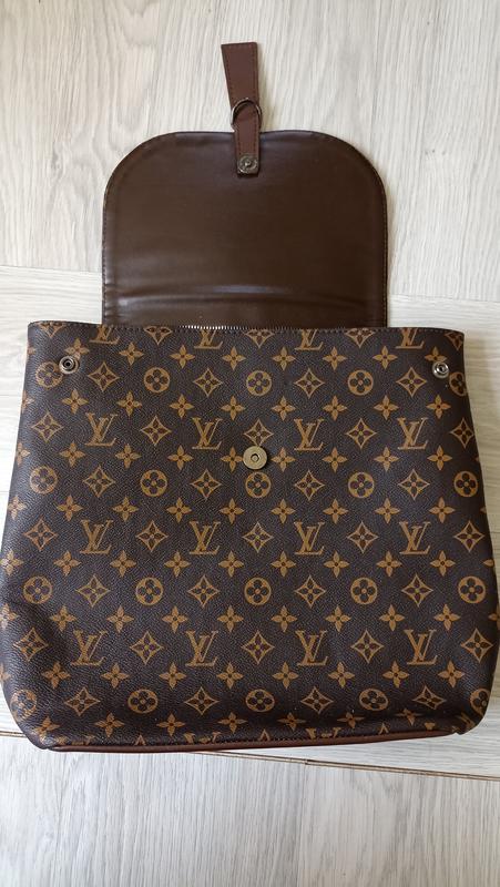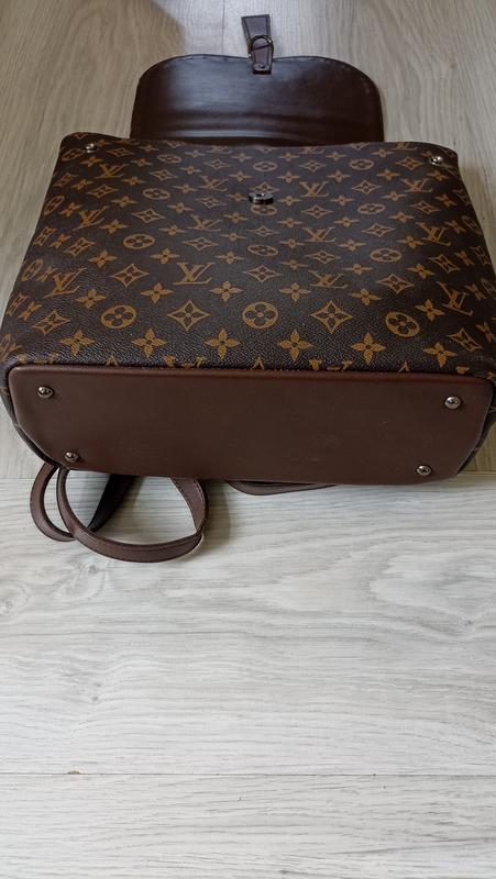 Рюкзак в кольористиці під Луис Вітон коричневого кольору з шкірозамінника, має одне відділення, та дві кишені на блискавці зовні та у середині. На металевих ніжках. Закривається на кнопку, та блискавку. Розміри 34*31*11 см. Має коротку ручку, дві довги ручки, які можно трансформуватися в одному довгу.