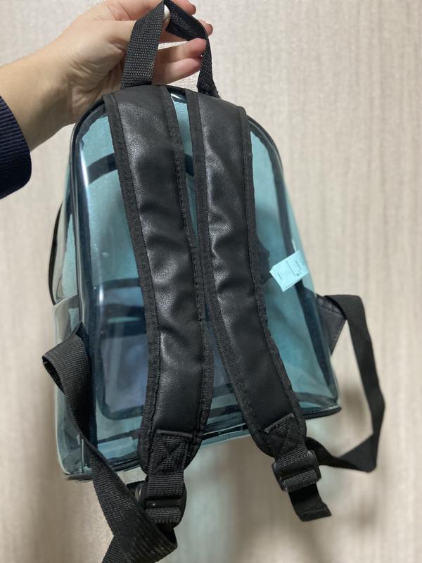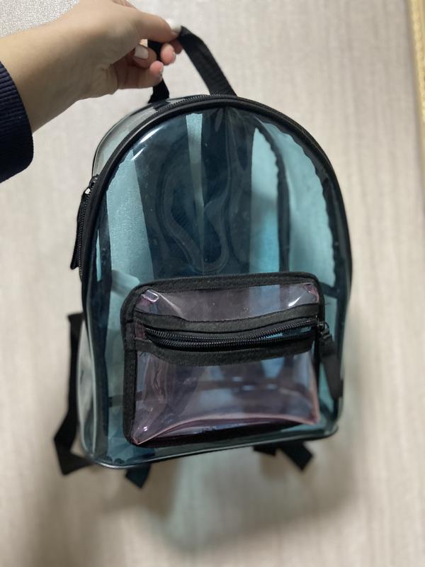 Рюкзак прозорий, досить вмісткий має одне головне відділення та одне маленьке , з чорними ручками,гарно тримає форму та нереально стильний і оригінальний