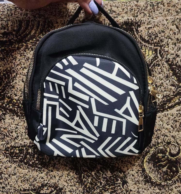 Чудовий якісний жіночий рюкзак невеликого розміру з геометричним принтом). Можна носити як рюкзак або як сумку. Фурнітура золотиста! Рюкзак вмісткий, хоч і невеликий! Розміри: 21 x 18 x 11 см.