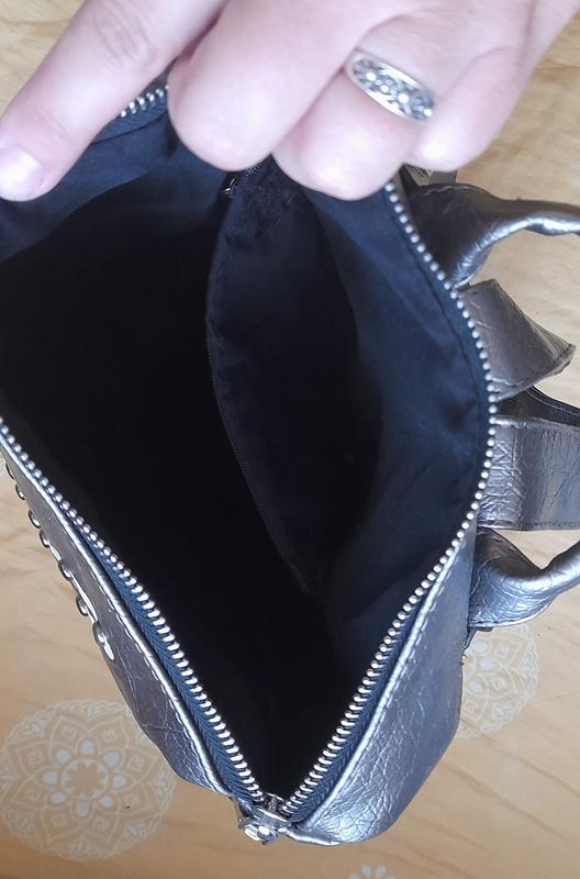 Гарний сумка-рюкзак сріблястого кольору з принтом мультиплікаційного героя Бакса Банні. Принт прикрашений металевими кльопками.