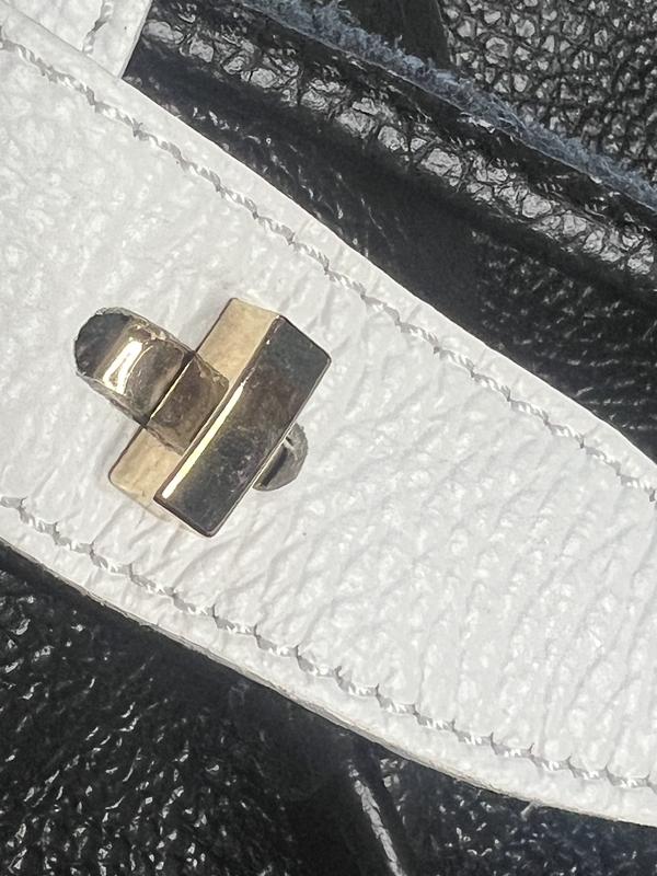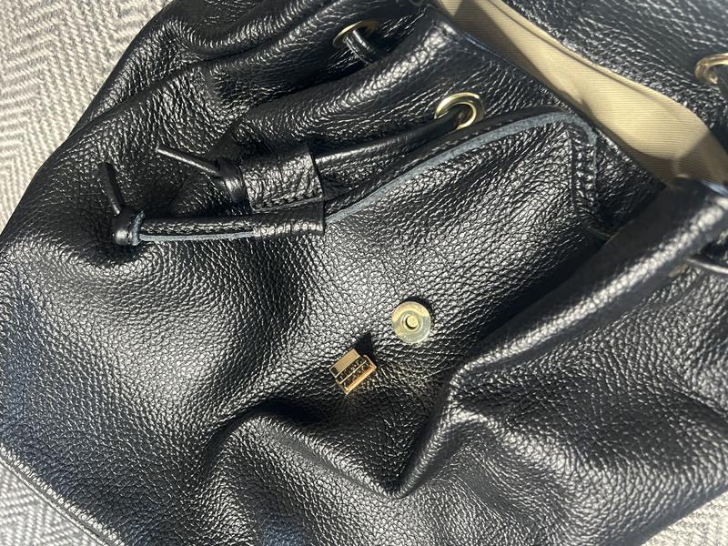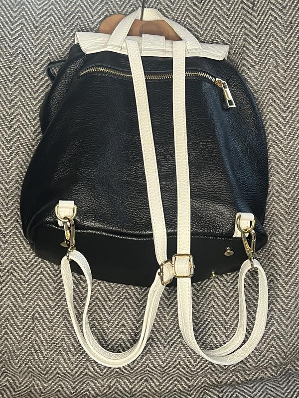 Рюкзак шкіряний Італія чорно-білий із золотистою фурнітурою на тонких лямках з карабінами. Висота 32, ширина 30, глибина дна 12. Застібка - шнурок, кнопка та декоративний замок. Без бірки