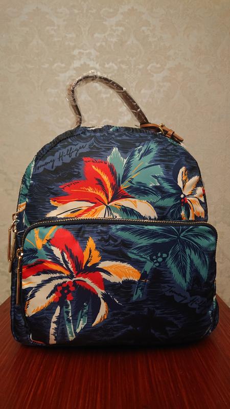 Дивно красивий новий жіночий рюкзак від відомого дизайнера Tommy Hilfiger з міцного поліестеру з тропічний малюнком і фірмовим логотипом в принті. Лімітованої серія. Застібка кишені і основного відділення на блискавках, всередині дві кишені на блискавці. Нагорі маленька ручка. Розміри: висота 28 см, довжина по низу 25, глибина 13 див.