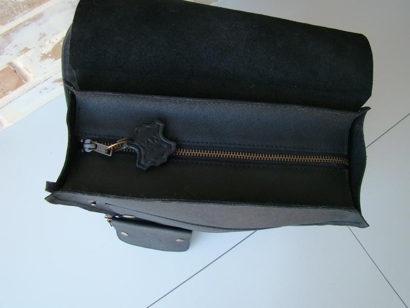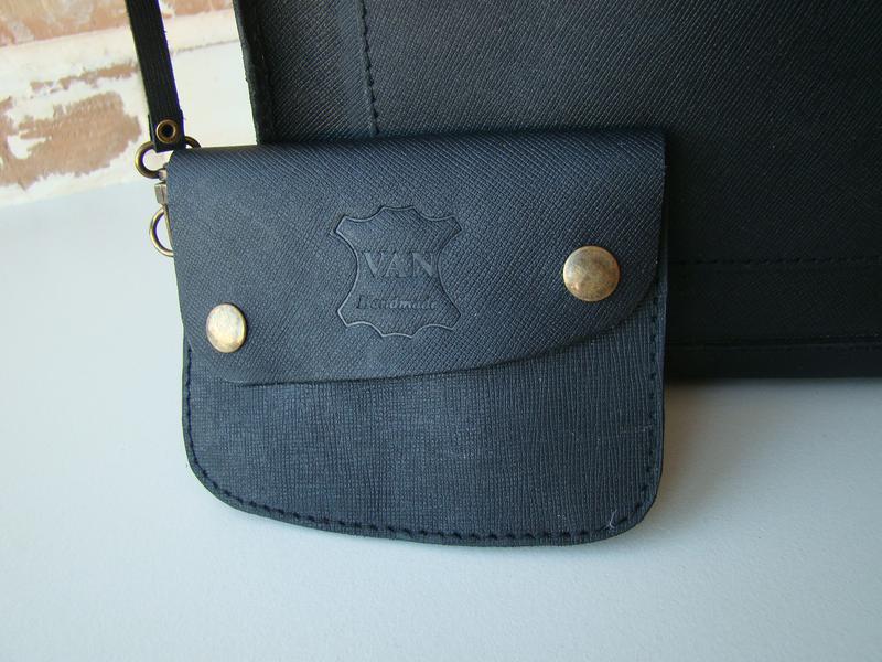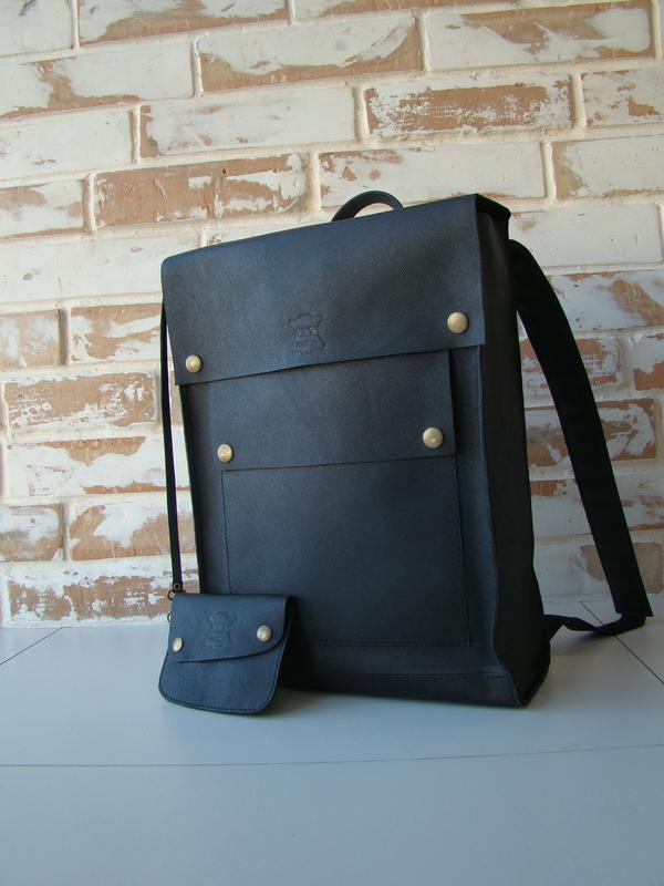 Размеры: Высота - 35 см, Ширина - 25 см, Глубина - 10 см. К нему в комплект пошит кошелечек из аналогичной кожи.