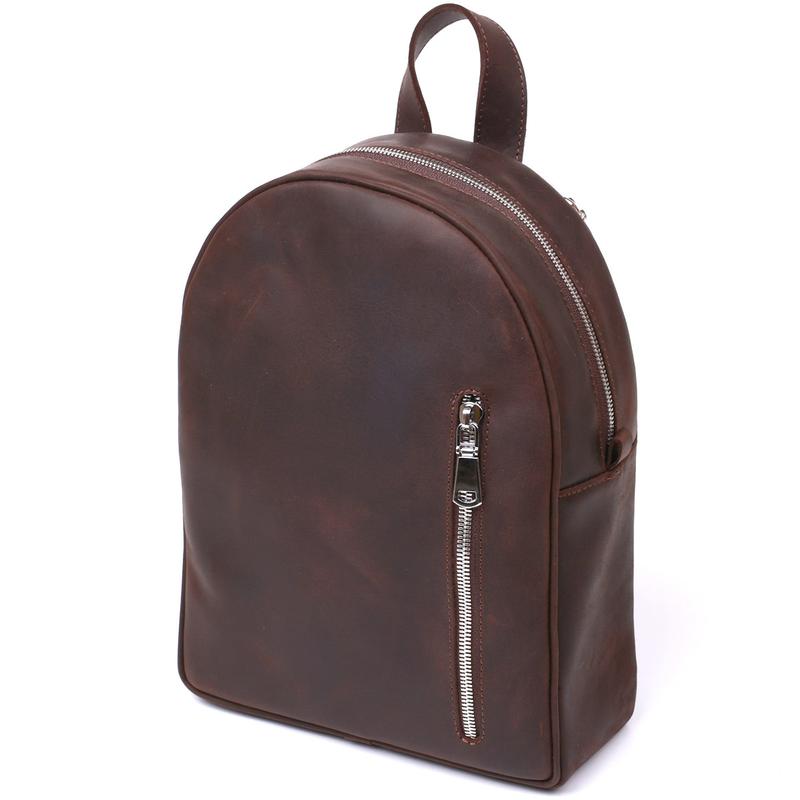 Матеріал: натуральна шкіра. Колір коричневий. Розміри (ШхВхГ, см): 21х28х9 см. Країна виробник: Україна. Бренд: Shvigel. Опис: - закривається на блискавку; - всередині 2 кишені, одна з яких на блискавці; - на зовнішньому боці кишеня на блискавці; - шкіряні регульовані шлейки та ручка для перенесення в руці. Стильний та практичний жіночий рюкзак невеликого розміру для повсякденного використання. Матеріал виготовлення - натуральна міцна шкіра високої якості. Колір виробу - насичений коричневий, фактура - гладка вінтажна, що виглядає дуже красиво. Усередині є містке основне відділення та дві кишені, на зовнішній стороні також є вертикальна кишеня на блискавці.