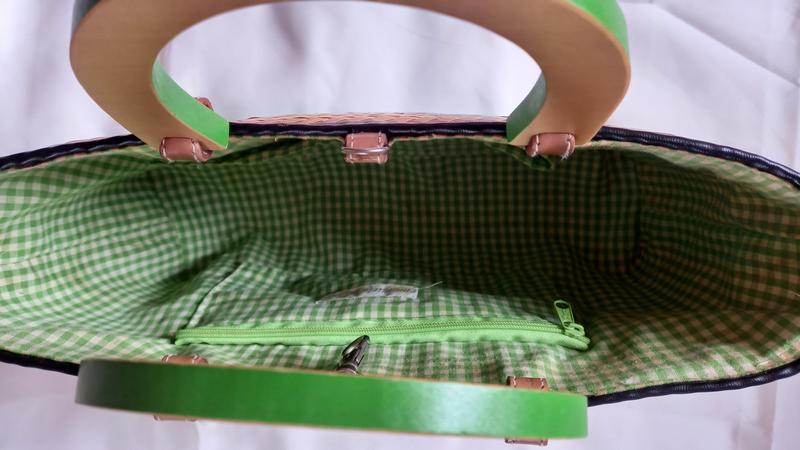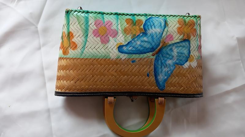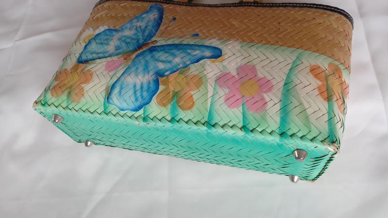 натуральний матеріал ротанг, ручки дерево Куплена в Італії, є сліди шкарпетки трохи на підкладі (по верху), оскільки бавовна до того ж і світленький, ручна розпис дно 30х9,5см, висота 19см