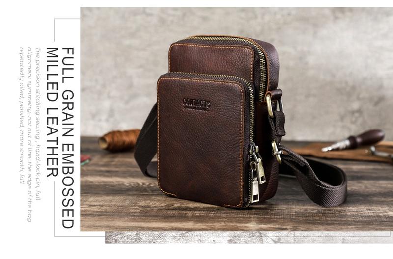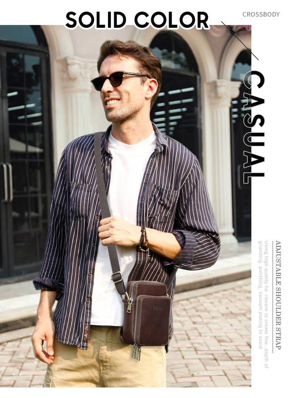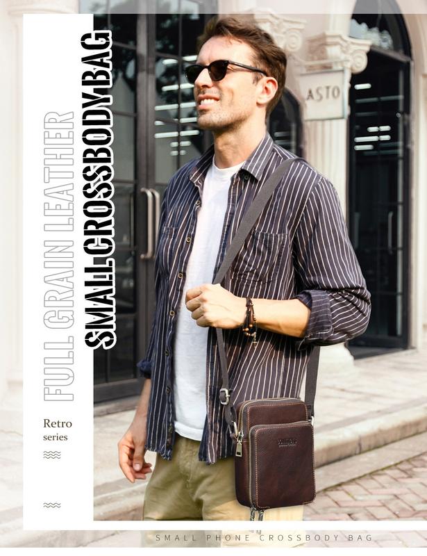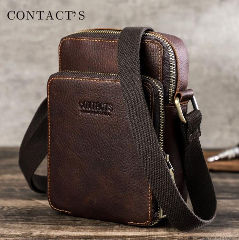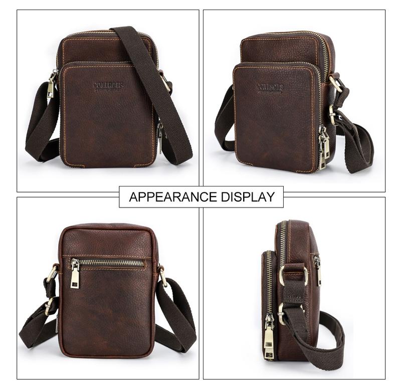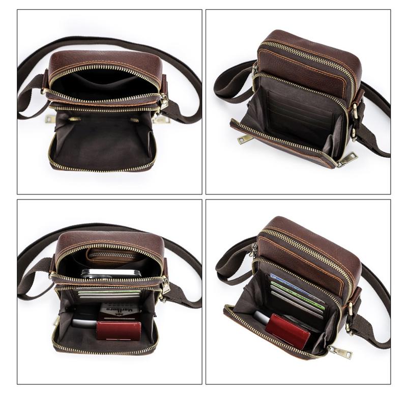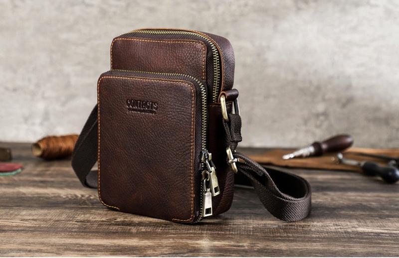 Небольшая мужская сумка, изготовленная из кожи. Позволяет освободить карманы одежды и хранить все самые важные вещи, а именно: телефон, кошелек, ключи, блокнот, наушники. Для выполнения своей функции имеется основной отсек и один вспомогательный карман, закрывающихся на металлический замок. Для ношения сумки предусмотрен регулируемый наплечный ремень из плотного текстиля. Фурнитура (все замки) металлическая.