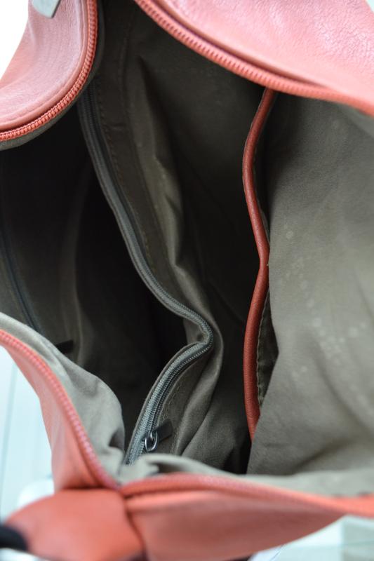 Розмір сумки 34 по дну*34*13 (Довжина * Висота * Глибина). Усередині врізна кишенька на блискавці і дві бічні відкриті накладні кишеньки, посередині відділення-перегородка на блискавці. Позаду врізна кишенька на блискавці. Спереду функціональна кишеня на блискавці.